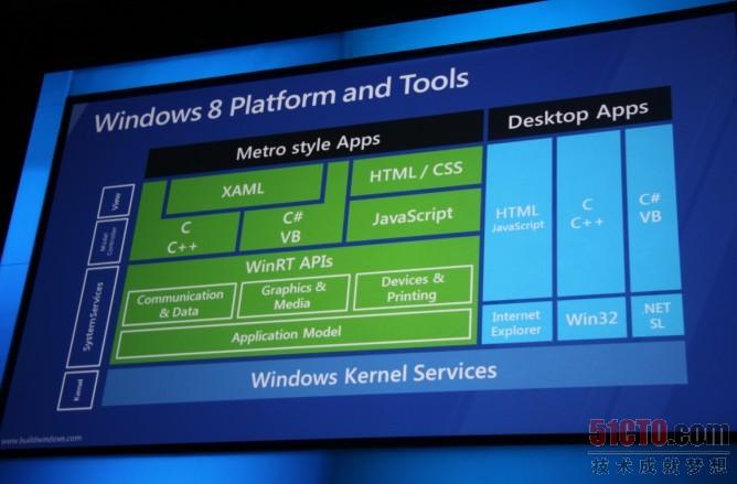 Windows 8开发人员预览版在Build大会上亮相,微软的工程师们将开发人员关注的WinRT APIs的细节在大会下午的Big Picture环节一一详解。在Windows 8平台与工具的整体架构上可看出,WinRT库中有大量的API,同时支持C++、C#、VB与JavaScript,HTML/CSS、XAML在 x86/64与ARM平台上,WinRT中也包括了Win32、COM 与 .NET Framework,Silverlight和HTML5都可进行Metro Style的UI设计与用户体验。 图1 Windows 8 Platform and tools架构 图2 Metro风格API库 WinRT APIs的模板中内置了图形加速工具,能快速实现Metro Style丰富的用户界面体验,实现触控与扩展。在Windows 8平板电脑上打开Visual Studio 11的新建Project,可看到右侧下方就是Metro风格的轮廓。用C++简单的开始测试“Hello World”,Windows 8还强调同样的代码可运行在不同的平台上,Metro Style兼容了Windows 8与Windows Phone。在Windows 8中应用接口的调用方式简化了,包括专门为UI设计人员提供的工具平台Microsoft Express Blend。 图3 在Visual Studio 11中开始创建一个新的Project 图4 图5 测试Hello World 图6 图7 Windows 8应用程序可以无缝运行在Windows Phone上 Windows & Windows Live 总裁 Steven Sinofsky在Build会场上谈到,触摸技术改变了人们使用电脑的习惯,Windows 8的触控体验将改变大家已有的认识,重塑Windows平台。胆从本次发布的由三星制造的Windows 8平板电脑的配置,机身周围的传感器、Micro SD插槽、USB 3.0接口、HDMI 输出口,并有返回desktop中,保留了Windows 7的用户桌面,还会有效的保护原有大量用户的使用体验。 图8 图9 Developer Power PC-Windows 8 Developer Power PC-Windows 8的发布为后面企业应用开发有所帮助,也为阿里云应用开发提供了便利 上一条: 怎样用Java平台访问开源云存储 下一条: IaaS与PaaS服务对开发的好处