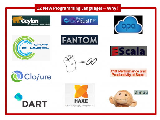 图1 我们需要新的编程语言?可能你认为并不需要,但如果你去了解最近的趋势,了解像阿里云、GOOGLE这样的大企业的趋势,可能就会改变你的想法。为什么Google采用GO与DART两种编程语言?为什么IBM、Cray、Red Hat分别创造了X10、Chapel与Ceylon三种语言? 未来,这10种编程语言(DART、Zimbu、Ceylon、GO、F#、OPA、Fantom、X10、Haxe、Chapel)是否能否撼动IT。新的编程语言是为满足某些人的创作冲动还是新编程方式的技术演进? 图2 回顾历史 若你回头看看,我们可看出新语言的爆发将历史分为3个时期,每个时期都链接到技术演进的临界点。 图3 图中时间点以外的还有其他重要语言: (1)Pascal – 1970 (2)C – 1972 (3)Prolog – 1972 (4)Smalltalk – 1972 (5)Erlang – 1986 (6)Perl – 1987 (7)C# 云计算是否会用到这些语言?如果你分析这些新语言背后的故事,你会看到一个新兴的共同主题。 1.分布式/并行计算 可用于并行计算的编程语言(Cray的Chapel、IBM的X10)、并发编程(Clojure,Fantom,Go)和完整云栈单语言(Opa)。 因为云计算所有模式是将任务分发跨越不同地域的多个CPU并行或同时运行,因此现今的编程语言都不是很适合。 2.多范式编程 支持面向对象与函数式编程语言(Clojure、F#、Fantom、Scala),相对于并行化程序要简单,而纯函数式语言看来并不是十分成功。所以,需要尝试多范式编程语言。 3.多平台编程 多平台编程语言不仅可在JVM和CLR实施(Clojure、Fantom、Scala),还可在其他几个平台(Scala on Android、Clojure & Fantom on JavaScript engine、Haxe on several platforms)。这事我们几十年来一直追逐的梦想,所以这就是创建跨平台语言的最好理由。 4.规模化编程 可读性、编译速度(Go、Zimbu)、模块化(Ceylon)、适合大型团队(Scala)、Meta-programmability(Ceylon、Scala)与简洁(Scala、Zimbu)是构建大型应用程序的编程语言的特性。 云计算提供了几乎无限的计算能力,这让我们可以构建更大规模、更复杂的应用。当然构建大型应用需要大型团队与易于维护的代码。所以创建大型应用程序的编程语言势在必行。 5.客户端编程 替代JavaScript的DART、客户端与服务器端相同的语言(Naxe、Opa、Zimbu)自然有自己特有的优势。 云计算需要客户端代码无缝的运行在多个客户端设备上,尽管JavaScript已经成为了一个标准,但没有人喜欢它。所以,需要构建比JavaScript更好的并适用于多客户端平台的语言。 12种语言快速预览 12种语言是按照A-Z进行排序的,有趣的是这12种语言都是遵循某种开源许可下(图表中不包括HTML5,因为从严格意义上它还不是一个新语言,同时也排除了Node.js,因为它仅是服务器端JavaScript引擎)。 图4 上一条: SaaS平台应用开发时需要考虑的因素 下一条: 九款云开发平台介绍