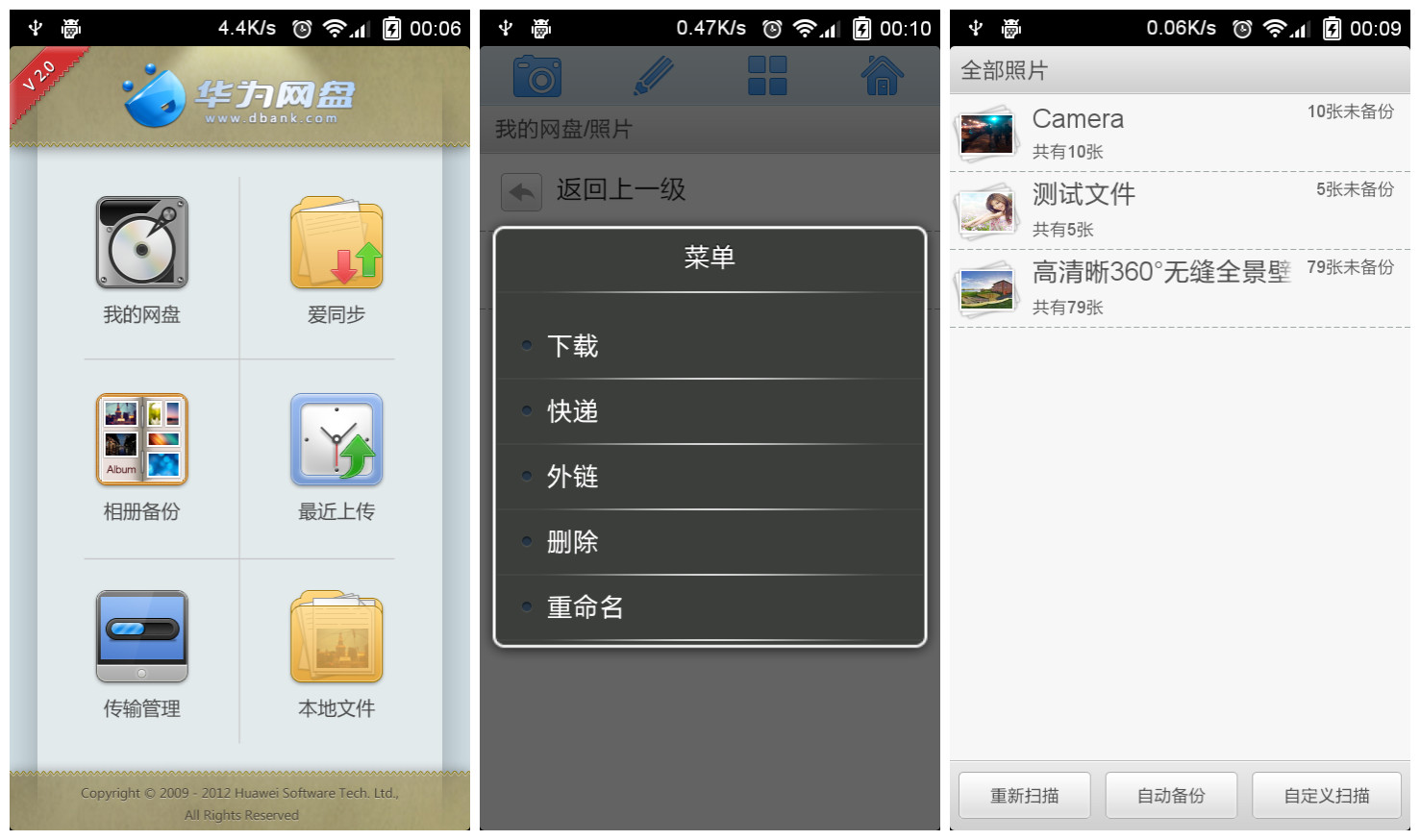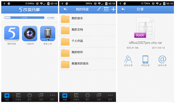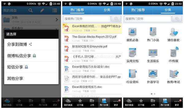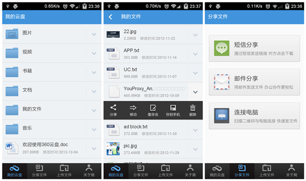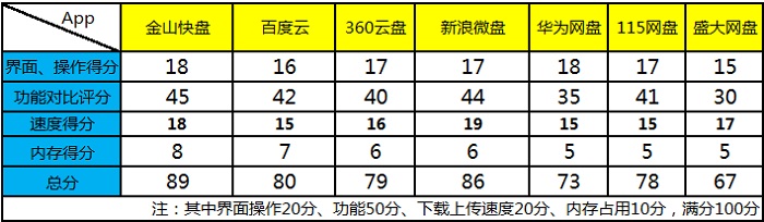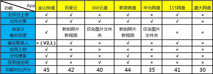 在国外Amazon、Google、Dropbox、微软以及苹果在云存储领域的战争可谓是硝烟弥漫,同样在国内百度、360、腾讯以及金山、阿里云等网络巨头也都在积极的布局自己的云存储战略,面对玲琅满目的云存储服务用户该怎样选择呢?随着科技的发展,用户的设备也越来越多,在不同设备之、间用户需要协同操作;移动互联网时代让移动办公也成为可能,用户的工作地点越来越分散,用U盘等传统存储设备同步备份显然太过麻烦,因此网盘的地位也就日益突出。 尽管GoogleDrive可让用户对办公文档等文件进行直接编辑,给用户办公提供了极大的便利,但由于GFW让天朝人民与之无缘,而Dropbox也一直处在将墙未墙的尴尬境地中,因此在稳定性上国内网盘相对来说还是有一些竞争力的(当然有人也许会说微软的SkyDrive还是很稳定的,从来没有被GFW),国内目前的主流网盘也基本上都实现了多平台同步覆盖,这里小编主要对国内的几款主流网盘Android客户端应用做一个横向评测,希望能给大家选择Android网盘应用时提供一些参考。 测试平台:Android4.04 评测对象: 名称 金山快盘 百度云 360云盘 新浪微盘 华为网盘 115网盘 盛大网盘 版本 V2.1 V3.3 V2.1V2.4 V2.0 V1.3 V1.1 在小编看来,对用户是一款好的网盘应用应该满足以下几点: (1)网盘不能限制用户上传的文件类型和单个文件大小,在文件类型上现在的网盘基本上没有限制,不过在单个文件大小上限制较多,相对于移动端来说用户也很少会在移动网络下备份大数据,这里单个文件大小就不作为评测标准了; (2)数据的安全性上,一般网盘都是一次登陆后就不再需要重新输入账号密码,用户的设备越来越多,用户数据会在不同的设备上流转,因此用户数据的安全性也显得非常重要,因而网盘需要让用户能自己对数据进行第二次加密或对访问权限加密,以此来保证数据安全; (3)同事之间需要协同办公时,文件的分享也就显得非常重要。 先一起来看看这七款Android网盘应用各自的功能对比,有哪些满足上面的要求呢?(满分50) 图1 1、金山快盘 图2 金山快盘的默认界面显示的分别是我的文件夹、云相册以及收到的共享文件(之前版本中的通讯录备份功能暂时关闭),主界面右上角可点击签到获得免费空间。 图3 在我的文件夹中可查看电脑以及其它设备中的快盘文件,点击相应的文件或文件夹可以将这些文件下载到手机中,也可进行重命名、共享、剪切和删除等操作。文件上传支持按照音乐、图片、视频以及应用等类型分类查找上传,当然其它类型的文件也可通过手机直接上传。 图4 打开设置可进行自动备份设置,可自定义备份的目录包括手机相册、截图相册、录音以及自定义文件夹等,对于小编做评测工作,截图相册自动备份功能帮助挺大的,所以非常喜欢这个功能,如果想节约流量的话就选择WIFI环境自动备份吧。金山快盘支持应用锁功能,可对访问权限进行二次加密,防止他人使用你的设备时看到你的数据,在数据的安全性上有较好的保障。 2、百度云盘 百度云盘的主界面默认显示的是我的文档、我的视频、我的音乐以及我的照片四个文件夹,在首次使用时会询问你是否开启WIFI下相册与通讯录自动同步备份功能,相册中的图片与视频会保存在“来自:设备名”文件夹当中,但除默认系统相册和通讯录外百度云盘并不支持其他文件夹的自动备份功能,在同步性上有所有所欠缺。 图5 点击“上传”按钮可将手机中的图片、文档以及音乐等文件上传到网盘中,而在“我的百度云”中图片、文档、应用以及音乐等文件也是可直接按照不同文件类型进行查看。 图6 在设置中可很直观的看到网盘中不同类型的文件所占空间的比例,上传与下载流量也一目了然。 3、360云盘 图7 360云盘为用户默认创建了包括视频、图片、书籍以及文档等分类文件夹,在其它设备中创建的文件夹也可在首页查看,点击相应的文件即可完成分享、移动、删除以及保存到手机等操作,而在分享文件中可选择相应的文件通过短信或邮件的方式将网盘中的文件分享给好友。 图8 360网盘支持备份手机中的照片与视频文件夹,也可直接调用相机拍照上传,而上传文件则可将手机文件夹中的不同类型的文件上传到服务器的现有文件夹或新建文件夹当中,360云盘同样支持自动备份,但也仅限手机中包含图片的图片文件夹。 图9 在“关于我”选项中手机文件上传记录会以时间线的形式显示,众多网盘都有签到、抽空间等形式给用户一些免费空间,360云盘则是使用的“摇一摇抽奖”的形式每天给用户一次获得免费空间的机会。 4、微盘 图10 微盘最大的特色就是结合微博进行文件分享,你可通过微博将微盘中的文件分享给微博好友,同时在热门分享中有热门的应用、行业资料等可下载,同样支持按分类查找相关的资料。 图11 微盘的默认界面是微盘里的个人文件,点击手机的菜单键可创建新文件夹或直接拍照上传,微盘还有个回收站功能,微盘文件夹中的文件若不小心删除了还可在回收站中找回,算是其它几款应用没有的一个比较人性化的功能。 图12 微盘上传同样支持按视频、音乐、图片、文档以及其他文件等分类方式,在“更多”标签中,签到可获得空间,微盘支持自动备份手机中新拍的图片与视频以及通讯录到云端。若手机上未安装文件阅读器,可下载微盘提供的阅读器插件,一般的文档类文件可直接应用内打开。 5、