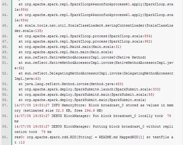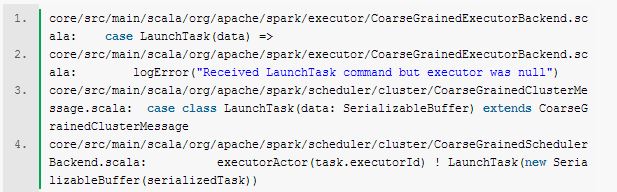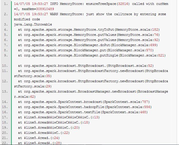 1、概要 今天请到阿里云的工作人员,简单谈谈spark,Apache Spark源码如何进行代码跟读。今天不谈Spark中复杂的技术实现,只聊聊怎样进行代码跟读。众所周知,Spark使用scala进行开发,因为scala有众多的语法糖,很多时候代码跟着跟着就觉着线索跟丢掉了,此外Spark基于Akka来进行消息交互,那怎样知道谁是接收方呢? 2、new Throwable().printStackTrace 代码跟读时,常会借助于日志,针对日志中输出的每一句,我们都很想知道它们的调用者是谁。但是有时候苦于对spark系统的了解程度不深,或对scala认识不够,一时半会内无法找到答案,那有没有什么简便的办法呢? 我的办法就是在日志出现的地方加入下面一句话,如下所示 new Throwable().printStackTrace() 现在举一个实际的例子来说明问题。 比如我们在启动spark-shell后,输入一句非常简单的sc.textFile("README.md"),会输出如下所示的log 那我很想知道是第二句日志所在的tryToPut函数是被谁调用的该怎么办? 方法就是打开MemoryStore.scala,找到下述语句 logInfo("Block %s stored as %s in memory (estimated size %s, free %s)".format ( blockId, valuesOrBytes, Utils.bytesToString(size), Utils.bytesToString(freeMemory))) 在这句话上,添加如下语句 new Throwable().printStackTrace() 然后,重新进行源码编译 sbt/sbt assembly 再次打开spark-shell,执行sc.textFile("README.md"),就可得到如下所示的输出,从中可清楚知道tryToPut的调用者是谁 3、git同步 对代码作了修改后,若并不想提交代码,那该怎样将最新的内容同步到本地呢? git reset --hard git pull origin master 4、Akka消息跟踪 追踪消息的接收者是谁,相对来说比较容易,只要使用好grep就行了,当然前提是要对actor model有一点了解。 还是举个实例吧,我们知道CoarseGrainedSchedulerBackend会发送LaunchTask消息出来,那谁是接收方呢?只需要执行下面的脚本即可。 grep LaunchTask -r core/src/main 从下面所示的输出中,可清楚看出CoarseGrainedExecutorBackend是LaunchTask的接收方,接收到该函数后的业务处理,只需去看看接收方的receive函数即可。 5、小结 今天的内容相对简单,没有技术含量,自己做个记述,免得时间久了,不记得。 上一条: Docker 1.1.1 发布 下一条: 分布式系统的开发