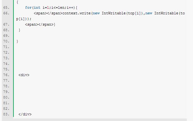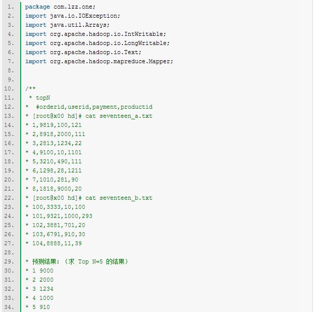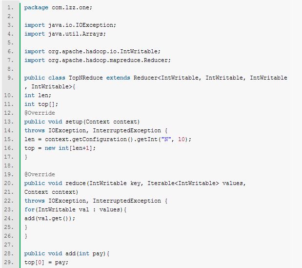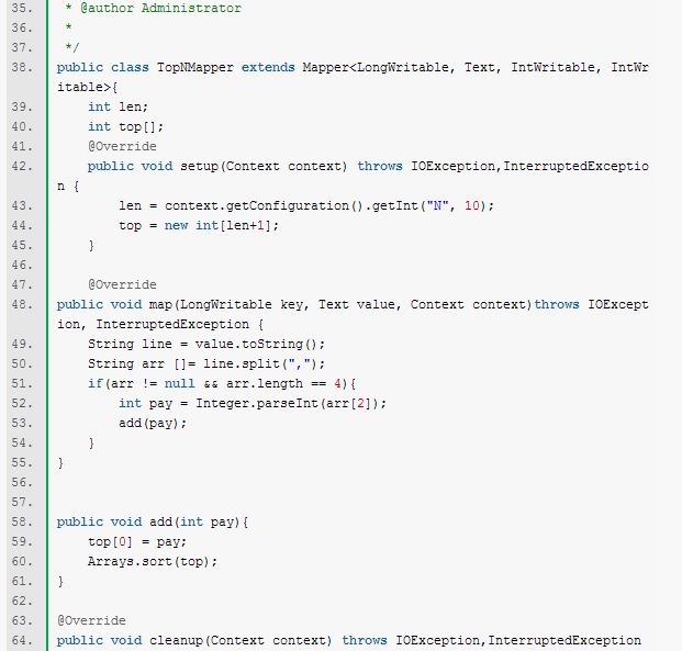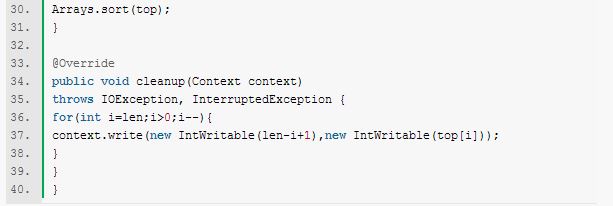 在最初接触mapreduce的时候,top n 问题的解决办法是将mapreduce输出(排序后)放入一个集合中,取前n个,但是这种写法过于简单,内存能加载的集合的大小是有上限的,一旦数据量大,很容易出现内存溢出。 现在在这里介绍另一种实现方式,不过这也不是最好的方式,但正所谓一步一个脚印,迈好每一步,以后的步伐才能更坚定。关注阿里云的动态,以后还会有更好的方式需求,得到top 最大的前n条记录。 这里只给出一些核心的代码,其他job等配置的代码略。 Configuration conf = new Configuration(); conf.setInt("N", 5); 初始化job前需要 conf.setInt("N",5); 意在在mapreduce阶段读取N,N就代表着top N。 以下是map 接下来是reduce在这里说一下逻辑,尽管画图比较清晰,但时间有限,画图水平有限,只用语言来描述吧,希望能说的明白。 若要取top 5,则应该定义一个长度为为6的数组,map所要做的事情就是将每条日志的那个需要排序的字段放入数组第一个元素中,调用Arrays.sort(Array[])方法可将数组按照正序,从数字角度说是从小到大排序,比如第一条记录是9000,那排序结果是[0,0,0,0,0,9000],第二条日志记录是8000,排序结果是[0,0,0,0,8000,9000],第三条日志记录是8500,排序结果是[0,0,0,8000,8500,9000],类推,每次放进去一个数字若大于数组里面最小的元素,相当于将最小的覆盖掉了,也就是说数组中元素永远是拿到日志中最大的那些个记录。 ok,map将数组原封不动按照顺序输出,reduce接收到从每个map拿到的五个排好序的元素,在进行跟map一样的排序,排序后数组里面就是按照从小到大排好序的元素,最终将这些元素倒序输出就是我们要的结果了。 同之前的方式做个比较,之前的map做的事情很少,在reduce中排序后哪前5条,reduce的压力是很大的,要把所有的数据都处理一遍,而一般设置reduce的个数较少,一旦数据较多的话,reduce就会承受不了,悲剧了。而现在的方式巧妙的将reduce的压力转移到了map,而map是集群效应的,很多台服务器来做这件事情,减少一台机器上的负担,每个map其实只是输出了5个元素,若有5个map,其实reduce才对5*5个数据进行了操作,就不会出现内存溢出等问题了。 上一条: 利用ambassador实现container跨主机连接 下一条: 云计算基础架构