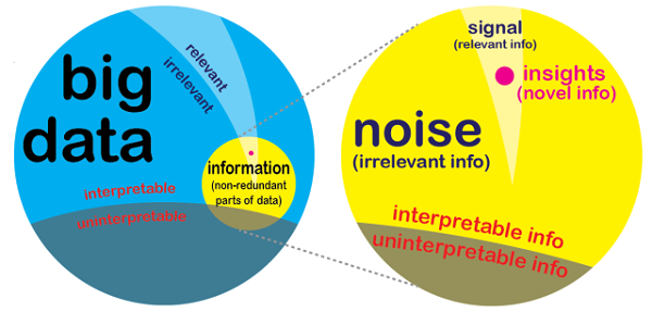 Michael Wu(博士) —— Lithium首席科学分析师,为Lithium提供社交网络数据复杂性探索和理解的方法。 数据的价值等同于从中挖掘到的信息和见解;并根据它们做出正确的决策,从而获得一定的竞争优势。而我们对于大数据的期望也是收集足够多的信息并获得有价值的见解。然而人们还没有意识到数据和信息的不同 —— 你从海量数据中提取到的信息并不一定都有意义和价值。 数据不等于信息 许多人口中的数据和信息都是等价的,然而两者之间却有着很微妙的区别。数据只是事情发生的简单记录,它只是记录了事情发生的时间、地点及涉及人物的原始数据。是的,数据中确实包含着大量的信息。这也正是对大数据理解的谬误所在:大数据虽然给你带来了大量的信息,但数据的增长却没有带来成比例的信息增长。实际的情况就是:收集的数据越多,从中提取到的信息比例越低。这就意味着随着数据体积激增,你从中提取到信息比例会逐渐的缩减。虽然听起来很不可思议,但事实就是这样的。下面来看一些例子: 例1:机场视频监视记录。首先,视频文件已经是相当之大了;其次,机场使用的是24/7闭路式监测系统,而HD设备会进一步增加数据的体积;最终,机场可能拥有成千上万的摄像头。如你所见,这些检测摄像头记创建的视频记录可轻松的获得“大数据”的资格。 不妨设想一下若我们把摄像头的数量提升两倍会发生什么 —— 双倍体积的数据。然而很显然你可能还是得不到双倍的信息。有许多的监视设备拍到的东西都是重复的,可能会有一些微小的区别 —— 不同的地区在些许不同的时间内会拍到完全不同的画面。在信息量这个方面,我们可能永远都得不到2倍。而且随着监视设备的增加,信息重叠的可能性也会随之增高。这就是为什么随着数据的增加,信息的收益却在减少 —— 其中的冗余越来越多。 例2:数据的备份和复制。若你认真查看你的电脑,你会发现:这些年的使用,你创建了成千上万的文件。不论它们是怎样产生的(拍的照片、写的博客或是发送的电子邮件),其中必然包含着一定数量的信息。这些文件储存在你的硬盘中,并占用一定的空间。 事情发生了:不出意外,你一定会定期的给数据做备份。这里我们可想象一下在第一次给硬盘做备份中花掉的时间。单纯针对数据的本身而言,你已经拥有双倍量的数据了。若你备份之前拥有50GB数据,那么备份以后你则拥有了100GB。然而经过了备份,你即可获得双倍的信息量了?结果是否定的。事实上完成这个操作以后你没有额外的获得任何信息,因为备份中的文件和初始磁盘上的文件包含的信息是完全相同的。尽管我们的私人数据和大数据不搭边,但这个例子却阐明了数据和信息之间微妙的差别。下面我们来看一下涉及到更大体积数据的例子。 用不等式表达就是:信息 ≤ 数据。所以信息不应该是数据,而是没有冗余的数据。这也是为什么给数据备份却无法增加信息量的原因,因为拷贝是冗余的。 例3:社交渠道的更新。那么社交中的大数据又是什么情况呢,比如:Twitter。对比平时我们不妨多推特一倍的内容,那么Twitter肯定会获得两倍的数据。但Twitter有获得两倍的信息吗?很显然没有,决定信息量的是你推特的内容而不是次数。当然若我们推特的内容是完全无冗余的,那么Twitter毫无疑问的将获得双倍的信息。但这永远都不可能发生!我们来看一下其中的原因: 首先,我们会相互转发。因此在互相的转发中,会产生很多冗余;即使我们拒绝转发,而在同一时间发布同样内容的几率也是很高的,因为使用Twitter的人太多了。虽然每个推特使用的措辞可能会完全不同,但包含相同网络内容的不同推特所(可能是条博客、很酷的电影或者爆炸性新闻)所造成的冗余是很高的。此外,一段时间内我们很可能对同类的新闻感兴趣。因为我们推特的内容更趋向于我们的品味和兴趣,所以同一个人推特不同的内容都会存在一些冗余。 所以很清楚的看到:即使对比平时我们多推特了一倍的内容,却因为中间存在着相当多的冗余导致Twitter不会获得双倍的信息。此外我们还会通过不同的渠道获得相同的内容,但因为仅仅是拷贝我们不会多获得任何信息。所以尽管数据会带来信息,但是数据不等于信息。信息只是数据中不重复的部分。这样的话,我们从数据中提取到信息只占数据总量的一小部分。所以虽然理论上信息是小于等于数据的,但现实中往往是信心远小于数据。因此大数据可捕捉大量信息的想无疑是天真和不切实际的,大数据的价值完全被夸大了。 信息不等于见解 尽管我们从大数据中提取的信息量也许被高估了,但从大数据中获得的见解仍然是极其宝贵的。那么信息和见解两者又有着是什么样的关系呢?所有的见解都源于信息,但是不代表所有的信息都可以提供见解。对于能给出有价值见解的信息,我们有3个标准: 1、关联性。必须是和用途与价值紧密相关的信息。相关的信息通常被看作是信号,而不相关的则被作为噪音。然而关联性有着相当的主观成分,对一个人很重要的信息可能完全和另一个人无关。这也是Edward Ng(一个著名的数学家)说过的:“一个人的的信号恰好是另一个人的噪音。” 此外,关联还不仅是主观的;同样是前后联系的。关联还可能是人从一个环境中换到了另一个。打个比方:如果我下星期将要去NYC的话,那么NYC的交