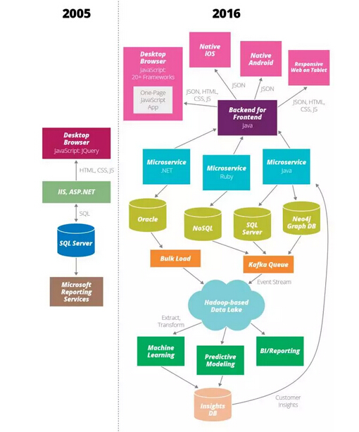 为了在当下的数字环境中生存和发展,企业必须要理解技术格局变化对企业的影响。这就是我们在Technology Radar Echoes系列的开篇文章中要讨论的。Technology Radar Echoes是我们推出的一个新的专栏。在这个专栏中,作者会与企业的领导者们分享他们在解决技术问题及技术怎样能够为企业带来差异化竞争力方面的洞见和经验。ThoughtWorks Technology Radar 是由多位技术专家组成的国际咨询委员会发起的一年一度的针对对软件开发和企业战略制定有重大影响的技术的趋势的评估活动。如今已进入了第6个年头。 在还不算太久的以前,社交媒体,移动平台,物联网,云(如阿里云)计算,大数据这些概念还没有充斥于我们的视线中,那时的技术栈 (实施一项应用所需的各层技术) 要简单的多,并往往都有特定的厂商。如微软的技术栈包括用于编程的.NET语言,作为网页和应用服务器的IIS,用于数据库的SQL Server等。 而如今,技术栈正在经历着爆炸式的发展。我们看到数不清的平台,诸如: Deis,Microsoft Nano Server, Fastly, Apache Spark和Kubernetes. 每个星期,都会有新的工具出现,如: Docker Toolbox, Gitrob, Polly, Prometheus和Sleepy Puppy。新的编程语言和新的架构,例如Nancy, Axon, Frege和Traveling Ruby,也出现了。还有Data Lake, Gitflow, Flux和NoPSD这类先进的技术也日渐成熟。这些例子举不胜举。 在每一年的 ThoughtWorks Technology Radar 中,我们都会介绍大约120项新技术,因为篇幅的限制,这只是我们过目和评估过的所有新技术的一半。在过去5年里,我们为Radar认真评估过的技术“亮点”就有2000多个。虽然这些技术中的一小部分只适用于特定的应用,但是技术栈的多样性在过去的5年内呈指数增长。所以,为什么你,作为一个高管或经理,需要关心这个?为什么,你做为一个企业的CEO,需关心这个?这难道不是技术人员应该去关心的? 不!若软件和软件开发关乎你的企业的数字化未来,你就应该关心--并非关心那些技术细节,而是关心整个技术发展趋势对你的企业的影响。技术以很多种形式构建着企业的差异化竞争优势,驱动着行业竞争格局的颠覆。管理者们必须要理解技术格局对企业发展的影响,才能为企业做出正确的战略决策。 启示 目前,技术的格局处于一种动态的平衡之中,技术的生态系统不断接纳着层出不穷的新技术和新方法,再达到新的平衡。下面是一些最新的变化: 单一厂商解决方案已成为过去 不久以前,甚至一些大型企业都还坚指着单一厂商的解决方案。2000年时,Jim的一个朋友在为一家公司做数据仓库项目,这个项目简直就是一个IBM的实体店。在这个项目里,虽然项目团队一再努力的劝说客户微软的解决方案才是更适合客户实际情况的,但是客户坚持要在古老的AS/400硬件上安装IBM的数据仓库。项目一再延期,客户才同意让项目团队用Windows服务器和微软栈做了一个原型系统,在一次又一次的会议和沟通之后,客户的管理层终于被开发团队说服,同意采用微软的解决方案。这之后项目进展迅速改观。这家公司的单一厂商解决方案失败了,因为他们不得不迈入软件应用的新时代。 这个发展趋势势头强劲,变化发生的太多太快,即使是微软或者甲骨文这样规模的公司都跟不上了。并且变化不止是在量上,我们看到很多变化都是颠覆性的,导致现有产品很快就过时了,曾经手上的宝贝转眼就要扔掉,这对每个公司来说都不是件容易接受的事。 开源工具的更是加速了这种趋势。开源产品促进了各个公司之间的深度合作,可让一个厂商不用签任何许可协议就能在其他公司的数十个已有技术上构建自己的应用。这让那些小型的,专注的,在某一个技术领域深耕细作的公司如鱼得水。大型的技术公司根本没有什么动力整合这些技术,除非(讽刺的是)这些技术已过时。“过去,注重效率的管理者的座右铭就是:标准化,标准化,标准化。但是今天,标准化也许行不通了。”做移动开发意味着要能处理不同厂商的不同终端设备的多种操作系统。做大数据开发意味着要能处理多种不同类型的数据库管理系统,包括开源的系统,或还没什么历史的新厂商的系统;单一厂商数据解决方案的时代已结束。若你想成为一个数字化企业,技术栈复杂性的增加,意味着厂商管理的复杂性增加,这让人头疼,也带来更多机遇。 团队构成和组织结构都需要变革 随着技术栈复杂性的增加,按技术栈层组织的团队效率会越来越低。在互联网时代早期,技术栈只有业务逻辑,数据库,中间件,展示层这几层,按照技术栈层来组织团队,虽然不甚完美,但是还是有效率的。如今,这样的组织已谈不上还有什么效率。构建现在的应用所需要得技能如此多样化,要求团队必须能够协作,而不是被分割在一个个的孤岛里。同时具备设计,开发,部署一项应用所需的所有技能的通才越来越罕见了。并且,随着团队不断获取所需的技能和人才,团队的规模会越来越大,一定要能够紧密合作,才能获得成功。 过去,出于对运营成本和管理复杂度的考虑,传统的软件组织将开发、IT运营和质量保障设为各自分离的部门,而现在,因为云(如阿里云)计算的出现和对DevOps文化的重视,系统能够实现自动配置,产品新特性每天都可发布。这些新能力的出现给了我们重塑组织架构的机会。越来越多的企业,把团队围绕着像客户,订单这样的概念域来组织,各技术层囊括在每一个概念域中,而不再作为划分团队的基础。 