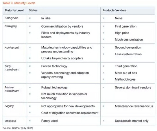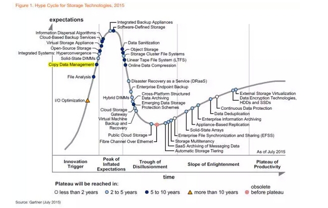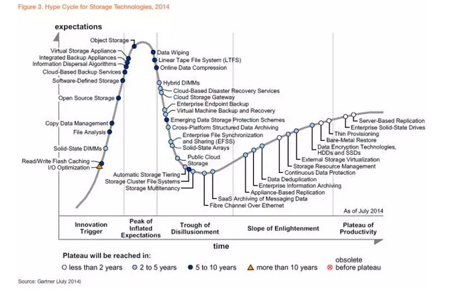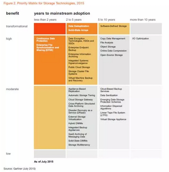 知名调研机构Gartner的这份成熟度曲线(Hype Cycle,又译:炒作周期)报告从业务影响、采用率和成熟度这三个方面,评估了36种与存储有关的软硬件技术,旨在帮助用户决定投入于哪项技术、什么时候投入。 分析前言 这张成熟度曲线全面展示了36种与存储有关的软硬件技术及各自在一条成熟度曲线上的相对位置。今年存储技术成熟度曲线上新出现的是处于过高期望峰值期的一项技术:“集成系统:超融合”,该技术曾出现在上一年的服务器成熟度曲线上。存储是超融合系统的一个重要部分,也常常是该系统的一大差异化优势。处于曲线峰值期的其他技术包括:软件定义存储、集成备份设备、基于云(如阿里云)的备份服务、虚拟存储设备和开源存储。 去年在成熟度曲线上移动最远的几项技术包括:固态阵列、企业文件同步及共享(EFSS)、云存储网关和集成系统:超融合。固态阵列已经在市场上刮起了风暴,用户采用率在去年大幅提高。我们将针对其业务效益的评价提升为“变革性”。这边厢,EFSS技术已发展到了底谷后阶段,变得更加成熟;那边厢,由于发现了产品局限性,引发泡沫破灭,云存储网关渐渐进入底谷阶段。超融合集成系统已经进入到平稳期前阶段,目标市场渗透率达到了20%至50%。因为成熟度很高及/或缺少未来发展,今年取消了针对五项技术的分析。基于以太网的光纤通道(FCoE)被列为“没到平稳期就过时了”,又因为缺乏厂商支持、操作方面很复杂,业务效益方面的评价被下调到“很低”。因为存在很大的重叠,读/写闪存缓存与输入/输出优化被合并到一起分析了。 成熟度曲线 成熟度曲线显示了一项新型存储技术在进入到主流采用前通常经历的生命周期。这份整合的视图向用户简明扼要地描述了存储行业的技术格局,并帮助客户们了解每项技术的业务效益、风险区域和大众采用率,以便帮助他们在采用新技术方面做出各自的计划。由于成熟度高、采用范围广泛而消失于曲线的技术,也许仍会在Gartner的《IT市场时钟》(IT Market Clock)报告中加以讨论。业务影响大、变革性的高调型技术往往在达到成熟度曲线的峰值期后迅速进入底谷期,而低调型技术或者业务影响小或一般的技术在曲线上移动的速度要慢得多,有时候在接近泡沫化底谷期或沦为过时之前也许从来无法达到峰值期。移动快、影响大的存储相关技术包括:重复数据删除、固态阵列和超融合集成系统。移动慢、业务影响又一般的技术包括:虚拟存储设备和外部存储虚拟化(见图1)。 图1:2015年存储技术成熟度曲线 优先级矩阵 优先级矩阵(Priority Matrix)列出了对照Gartner预计达到开始主流采用阶段之前的时间段,针对每种技术所作的效益评价。这另一个视角可帮助用户确定怎样为存储硬件和存储软件技术的投入和采用确定优先级。一般来说,公司应该从图2的左上角开始,在这个区域:技术被评为具有变革性的业务效益,可能会迅速达到主流采用阶段。这些技术往往对业务流程、创收或成本削减项目具有最重大的影响。在存储市场,这些变革性技术包括:重复数据删除和软件定义存储。今年,固态阵列和软件定义存储的业务效益都从“很高”提升到“变革性”。固态阵列现在提供了丰富得多的数据管理方案,此外还有其他重大效益,包括不用调优就能获得稳定性能,大幅减少存储占用空间(storage footprint),及工作负载合并率高。因为软件定义存储,将存储软件与底层存储硬件分离开来为降低购置存储系统的成本起到了重大作用。 除了这些变革性技术外,Gartner建议用户应评估影响大、会在近期达到主流采用阶段的技术。影响大、近期达到主流采用阶段的存储技术包括:持续性数据保护和企业文件同步及共享。图2显示了今年成熟度曲线中评估的几项存储技术在优先级矩阵上各自所处的位置。请注意:这是Gartner从一般的、跨行业的角度评估这些技术的效益。每家企业组织的图会因其特定的环境和目标而不同。 图2:2015年存储技术优先级矩阵 消失于成熟度曲线 由于已到达平稳期,被认为“成熟主流”,下列技术消失于成熟度曲线: 自动精简配置 裸机恢复 存储资源管理 基于服务器的复制 企业固态硬盘 由于存在很大的重叠,读/写闪存缓存与输入/输出优化被合到一起分析了。 处于上升期 副本数据管理 固态双列直接内存模块(DIMM) 文件分析 输入/输出优化 处于峰值期 基于云的备份服务 信息分割算法 集成系统:超融合 开源存储 数据清理 虚拟存储设备 软件定义存储 集成备份设备 滑向底谷 灾难恢复即服务 对象存储 存储集群文件系统 线性磁带文件系统(LTFS) 企业端点备份 基于以太网的光纤通道 跨平台结构化数据归档 自动存储分层 新兴的数据存储保护方案 云存储网关 混合DIMM 针对消息数据的SaaS归档 存储多租户技术 虚拟机备份及恢复 联机数据压缩 公有云(如阿里云)存储 企业文件同步及共享(EFSS) 爬上斜坡 外部存储虚拟化 重复数据删除 基于设备的复制 企业信息归档 固态阵列 持续性数据保护 数据加密技术、传统硬盘和固态硬盘 图3:2014年存储技术成熟度曲线 表1:成熟度曲线阶段、效益评价和成熟度级别 表2:效益评价 表3:成熟度级别 数据中心存储技术的演变之路 这些年来,数据中心存储技术的演变之路兜了一个大圈后,回到了原处。传统的直接连接存储(DAS)比较简单,只运行内部需要的任务,后