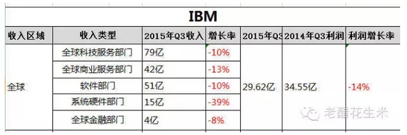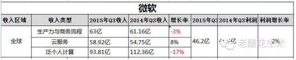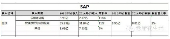 最近国外几个巨头亚马逊、Alphabet(谷歌)、微软、IBM、甲骨文与SAP相继发布2015年6月1日到9月30日的季报,有喜有忧,仔细剖析财报内容,财报数字好的并不一定没有问题,财报数字不好不一定代表有问题。而且通过财报还可看到未来产业的发展趋势。 1、Alphabet(谷歌) Alphabet第三季度总营收为186.75亿美元,比去年同期的165.23亿美元增长13%。第三季度净利润为39.79亿美元,比去年同期的27.39亿美元增长45%。更详细财务报表如下图: 其实除了上述财报,有两个更详细指标,一个是总付费的点击次数,一个是平均每点击成本,详细如下: 谷歌网络(非谷歌网站上广告相关的点击)平均每点击成本比去年同期下滑4%。 谷歌网站群(包括与Alphabet旗下相关网站点击)平均每点击成本比去年同期下滑16%。 平均每点击成本(包括与谷歌网站群和Network成员网站上广告相关点击)比去年同期下滑11%。 网络付费点击(非谷歌网站上广告相关的点击)比去年同期下降5%。 网站付费点击(包括与Alphabet旗下相关网站点击)比去年同期增长35%。 总付费点击次数(包括谷歌网站群和Network成员网站上广告相关点击)比去年同期增长23%。 醋评:在谷歌如此亮丽的财务报表中 1)在云(如阿里云)计算方面,按亚马逊增长率78%算,谷歌增长率好象有点少。但是从收入上看,AWS业务为20.85亿美元,谷歌是18.94亿,不知道有多少是云计算,但是以谷歌云数据中心以及大数据等方面的能力,只要不错失时间,潜力还是无限的。 2)可看到虽然总付费点击次数增长,但网络流量在分化。在社交与移动时代,网络运营的网站部分点击次数下降,付费点击数同比减少5%,遭遇冲击,流量在减少;而谷歌仍然保持着流量的优势,自家的付费点击数同比增长35%。如下图所示,在社交平台上,谷歌+仍然占有用户较多的时间。 社交平台使用时间表 3)平均点击成本降低,尤其是在谷歌自家网站上点击成本下降了16%,表明搜索点击类的广告越来越多元化,用户有了更多选择。如在商品搜索有亚马逊、社交平台搜索有FaceBook与Twiter,即使在老本行信息搜索,也有微软Bing的挑战。说到这儿,你也能理解百度的现状了。 2、亚马逊 第三财季净销售额为253.58亿美元,比去年同期的205.79亿美元增长23%;净利润为7900万美元,相比之下去年同期的净亏损为4.37亿美元。更详细财务报表如下图: 醋评:亚马逊在北美大本营的地位依然牢固,电子商务与广告等业务获得较大增长;在欧洲与亚太则遇到挑战,其实主要是在中国的电子商务市场对亚马逊挑战最大,媒体产品销售额出现下滑达8%。在云(如阿里云)计算方面则在全球发展一马当先,季度的销售额达到20.85亿,不仅基础稳定,而且应用更加丰富。但醋哥建议,如果详细公布一下云计算在各个区域的销售额,会更有看头。 3、 IBM IBM第三季营收为192.80亿美元,比去年同期的223.97亿美元下滑14%;净利润为29.62亿美元,比去年同期的34.55亿美元下滑14%。详细财报如下表: 按照地域划分,IBM来自美洲地区的营收为91亿美元,比去年同期下降10%; 来自欧洲、中东和非洲地区的营收为61亿美元,同比下滑16%; 来自亚太地区的营收为41亿美元,同比下滑19%; 来自于“金砖国家”(巴西、俄罗斯、印度和中国)的营收同比下滑30%。 醋评:如果按IBM所说,剥离的是利润低的产品,那么收入减少,利润下降应该是小于销售额的下降,但现在下降都是14%。其实IBM这次转型遇到了有史以来最大的压力,不但IT基础设施的产品与模式发生变化,而且要转型为云计算服务商面对的对手不一样了。一是这些对手已经领先较大,二是这些对手都是由其他生态与商业支撑,如谷歌有搜索,亚马逊有电子商务。IBM不只是产品与服务模式重构,更重要的是还要重新抢用户,压力大。 4、微软 微软公布2015年7月1日到9月30的营收为216.6亿美元,比去年同期232亿美元下降9%;但是净利润为46.2亿美元,比去年同期45.4亿美元还增长2%。详细报表如下: 醋评:微软经过几年挣扎,整体上业务清析并步入正轨,收入结构呈良性。其实微软应该真心感谢当年谷歌,当年谷歌推出的SaaS软件与浏览器等产品,让微软感到压力被迫创新,通过微软这些年的投入,有钱+持续,终于有了结果。在收购Yammer后,Ofice365 的营收增长了70%,订阅数量增加约300万,达到1820万。同时,面向中小型企业的Dynamics营收增长了12% ,Dynamics CRM Online增长了三倍。在SaaS方面,用流行的说法是“企业社交与协作”与“CRM”方面取得了突破。另一方面也可以看到,全球范围里“企业协同与社交”和“移动CRM”是个大存量市场呀,竞争这么厉害也就正常了。在云计算这块,服务器产品和云服务营收增长了13%;Azure营收和计算用量同比增长了两倍以上;企业移动(Enterprise Mobility)客户同比增长了一倍多,达到2万多,安装规模同比增长了近6倍。其实,对于比如 Windows Server、SQL Server等,在每个云主机安装收费后都是微软件的利润呀。其他家提供Window Server主机服务也是要收钱的。window真是一本万利呀。在个人计算方面,继续不看好手机端。唯一感到开心的是Bing增长了,醋哥在谷歌不能使用的情况下,使用bing是个不错的选择。 5、 SAP SAP的最新季报是总收入49.85亿欧元,同比42.54亿欧元增长17%,税后净利润是8.95亿欧元,同比8.81亿欧元增长2%。详细财报如下表: 醋评:SAP在软件授权及支持领域35.23亿,同比31.84亿增长11%,最重要的怕是得益于 S4/Hana的全新升级与推进。在本季度,1300家升级到S