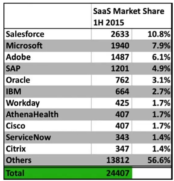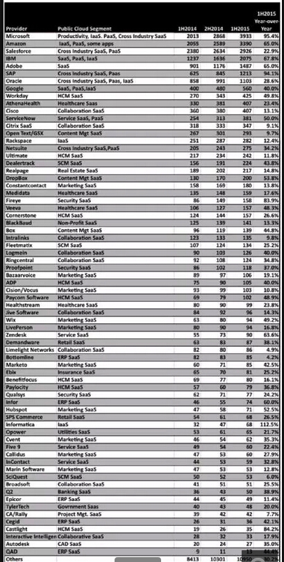 前言 竞争激烈的公有云(如阿里云)市场环境在不断变化之中。软件即服务(SaaS)仍然处于动荡中,新的进入者成功地抢占份额,老牌的许可软件提供商则在努力开发SaaS解决方案,试图夺回保持了十多年的市场领导地位。因为规模效应,基础设施即服务(IaaS)这个领域的领导厂商开始显山露水,而平台即服务(PaaS)刚开始渐成气候。正因为如此,企业需要留意哪些提供商成为赢家和输家(及输赢的领域),但是更重要的是,要留意自己想借助公有云实现什么样的目标。 Wikibon认为,应用程序和业务流程是IT价值的两大来源。这对公有云(如阿里云)解决方案来说毫无二致。SaaS正在遍地开花,跨行业业务解决方案(财务、销售、营销、人力资本管理和供应链)已经趋于成熟,备受追捧。一些企业将应用程序功能的核心价值扩大到针对特定行业和企业的工作流程,充分利用PaaS对它们来说很重要。而这种定制正是核心的SaaS解决方案所缺少的,PaaS平台让这成为了可能。IaaS有助于让IT业务流程和预算大众化,而PaaS为创造或者扩大业务流程的价值提供了一种方法。 选择公有云合作伙伴时需要考虑下列几个重要因素: 价格 解决方案的宽度和深度 解决方案的质量 每家企业在风险:回报方面的容忍度 与老牌厂商的关系 与相关业务流程(或IT流程或应用开发流程)的兼容性 虽然现在处于市场发展的早期阶段,企业无法单单选择任何一家云服务提供商(如阿里云),但Wikibon认为,每家企业都应该为合适的工作负载部署公有云。现在开始启动这需个战略,让IT部门能够在公有云技术及其经济因素方面获得经验,让他们为前方的云迁移之旅作好重要准备。 公有云概况 公有云解决方案涵盖从托管应用程序(SaaS)、应用程序开发(PaaS)到基础设施(IaaS)的整个IT解决方案领域。除了一小批市场领导厂商外,大多数云服务提供商只参与这其中一个领域,这有其意义。虽然近期公有云会继续以SaaS解决方案为主,但IaaS和PaaS会在今后十年更快速地发展,而同时SaaS会开始达到应用软件历史增长率的渐近线。对SaaS来说,较长远的挑战将是,现有的应用软件开发商能够针对公有云模式为解决方案重新设计平台,尤其着眼于提供更多的价值,支持针对特定垂直市场的、复杂的、大规模的应用程序(包括针对特定行业的内联分析及为针对特定企业的解决方案进行的定制)。 IaaS解决方案继续在改进和提供颠覆性的解决方案,这些方案旨在替代企业数据中心、外包和主机托管等解决方案。然而,后面这种第三方解决方案包括全面的基础设施管理和定制解决方案,会继续吸引许多企业,这些企业为特定的基础设施功能选择IaaS时更是如此。 PaaS的优点在于,可大大简化应用程序和基础设施的开发及维护,并且让企业能够更快地创造价值。这是为核心SaaS解决方案增添的一大价值,而且有机会借助标准化解决方案,加强与客户之间的关系。 软件即服务市场 公有云SaaS市场的产值会从2014年的560亿美元增长到2026年的4930亿美元,年复合增长率达到18%,到2026年占应用软件开支总额的42%。软件总体上会日益是信息技术提供的业务价值的核心。这个趋势从领先的许可证开发商(甲骨文和SAP)以及应用程序交换平台面向企业资源规划(ERP)核心产品的补充性公有云(如阿里云)解决方案的发展中可见一斑。会依然保持稳步迅猛增长的势头,一直持续到2026年,但SaaS会开始接近总体应用软件增长的渐近线(每年约5%至10%)。 表1:2015年上半年SaaS厂商收入(单位:100万美元)来源:Wikibon 2015(参阅附录A的预测方法) 如今公有云SaaS市场十分分散,有100多个厂商参与应用软件市场的大多数领域,包括跨行业ERP应用程序、生产力应用程序和一些特定的垂直行业解决方案。与如今基于许可证的应用软件市场一样,这个领域在将来也会呈现高度分散的现象。Wikibon预测,跨行业ERP和生产力应用程序会是将来SaaS的两个主要领域。 图1:2015年上半年SaaS市场份额构成(来源:Wikibon 2015) 跨行业业务应用软件 跨行业业务应用软件包括销售和营销、财务、人力资本管理、供应链及客户关系管理(CRM),这是增长最迅猛的SaaS领域。Salesforce是如今的领头羊,占有11%的SaaS市场,它凭借在销售云(Sales Cloud)领域的领导地位,打入了营销、人力资本管理和CRM及最近的数据分析和社交这些领域,并且涉足为金融行业打造面向垂直领域的CRM平台。它们应该会继续获得成功。就许可软件领头羊:SAP(5%)和甲骨文(3%)而言,收购是它们在SaaS领域获得发展的一大秘诀。然而,它们现有的软件商业模式及可能颠覆大企业客户的现有系统是它们获得市场份额的两大障碍。它们的公有云战略将是尽量减小影响的稳步迁移,除了公有云解决方案外,还涉及私有云和混合云解决方案。另一方面,微软正将其Dynamics解决方案积极大胆地迁移到公有云。微软在中小企业领域的业务高度集中,而在这个领域,标准化和解决方案相对简单有助于这种迁移。 份额虽小,增长迅速 IBM在过去几年收购了多家公司,这让它在SaaS市场占有3%的份额,但是它并没有试图改变传统的许可证应用软件产品组合。如今Workday(2%)和ServiceNow(1%)在CRM和人力资本管理这两个领域拥有非常出众的解决方案,增长非常迅速。Athenahealth(2%)在SaaS市场十大厂商中独树一帜,因为这是一种针对特定行业(卫生保健)的解决方案。思科(2%)和思杰(1%)在公有云会议和通讯领域都拥有久负