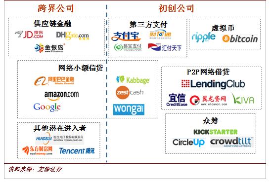 最近一年多以来,每次互联网公司往金融方向迈的零碎小步,都能成为舆论媒体界敲打在传统金融从业者心头上的沉重鼓点。有的人表现出极度的重视(比如这几位银行高层),有的人表现出不以为然,认为一旦互联网公司涉足金融行业,就注定逃不脱传统金融的模型与固有风险,有多深刻的创新可言? 在得出你的判断之前,应该了解正在发生什么、已发生什么。宏源证券的两位分析师易欢欢与赵国栋,近日做出一份很有价值的报告,名为《大数据时代的跨界与颠覆——金融业门口的野蛮人》。报告详尽描述、分析了在互联网与大数据冲击下,传统金融行业正面临的诸般挑战与新模式、新对手。 背景:传统金融业遭遇多线冲击 随着互联网和大数据的发展与普及,互联网企业跨界涉足金融业日趋常态,初创的企业也大量涌现,对传统金融业的多个领域形成冲击,从支付结算到投融资服务、再到流通货币,银行、保险、证券、基金等传统金融机构无一幸免,渗入范围不断扩大,并向金融业的核心领域拓展。金融业的潜在进入者通常是借助互联网等信息技术的创新和进步,从金融业的薄弱环节切入,通过破坏性产品或破坏性商业模式打破原有的市场结构,未来通过不断升级自身的产品与服务,也许会攀升到金融业产业链的顶端。 目前,中国P2P网络借贷、网络小额信贷等新模式兴起的一个重要原因是中国传统金融体系不够高效:一方面是人们收入大幅提高后释放大量的价值增值需求难以得到有效满足;另一方面是中国传统金融机构的风险控制机制将众多中小企业阻挡在门外,这便孕育着巨大的商业机遇。随着社会虚拟化和大数据深化进程的推进,潜在进入者将会不断扩张业务范围,同时,随着30年中国经济高速增长时期的结束及国家金融改革政策的推动,传统金融机构也面临转型,金融业的潜在进入者与传统金融机构的直面竞争关系会逐步凸显。起初,新兴金融力量与传统金融力量更多的是合作关系,但是慢慢开始演变成竞合关系,而且竞争的成分逐步大于合作成分。 谁是门外野蛮人? 金融业的潜在进入者可以分为两类:一类是跨界企业,主要是以阿里巴巴、京东商城、谷歌等互联网企业为代表,新兴新技术推动产业边界日益模糊化,跨界竞争日趋常态,这类企业依托在各自领域的多年积累,掌握了大量的用户数据,并借此进入金融业满足用户的金融需求,推动生态体系的发展;另一类是基于互联网的初创企业,具体包括支付宝、财付通等第三方支付企业,宜信、Lending Club等P2P网络借贷企业,Kabbage小额网络信贷企业等。 互联网和大数据打破了信息不对称和物理区域壁垒,使得中小型、区域型金融机构与大型、全国型金融机构站在同一层次竞争,迫使中小机构转型开展差异化竞争,否则将难逃被淘汰的结局。以证券公司为例,之前很多区域证券公司凭借区域优势收取较高的经纪费率,但在2013年3月,中国证券登记结算公司推出《证券账户非现场开户实施暂行办法》,允许用户通过网络进行开户,这将对区域证券公司带来较大的冲击。而若以它们侵入金融领域的不同来分,上面那张图则变成这样—— 野蛮人一:Lending Club引领金融未来趋势 1、Lending Club简介 美国Lending Club在2006年注册成立,在2007年正式运营,是一个汇集大量优秀借款人与贷款人的网上金融社区,是双方发生借贷关系的中间服务平台,试图以更为快捷高效的运作方式取代高成本、较复杂的传统金融机构,属于是一家典型的P2P网络借贷公司。P2P网络借贷最先开始于英国,2005年首个个人对个人(P2P)的网络创新借贷平台——Zopa出现,随后便迅速扩展至美国、德国等国家。Lending Club在P2P网络借贷的基础上引入社交网络(Facebook),并取得了巨大的成功,在资本市场上获得追捧,发展至今,Lending Club已经成功融资2多亿美元,不仅吸引了互联网女皇 Mary Meeker、摩根斯坦利前CEO John Mack和美国前财长劳伦斯•萨默斯的加盟,而且在2013年5月更是得到了世界互联网巨头谷歌的青睐,以 15.5亿美元的估值获得1.25亿美元的战略投资,豪华的阵容团队使得银行等传统金融机构不敢轻视,预计Lending Club将在2014年上市。 2、Lending Club创新的商业模式 Lending Club为资金供求双方搭建了一个直接交易的平台,同时也对借款人进行信用评分,为资金需求方提供决策支持。Lending Club主要是根据借贷人的社会安全号码(social security numbers)、FICO评分(要求660分以上,FICO分数区间是300-850)和信用报告(报告内容包括涵盖36个月信用记录历史等)等内容进行综合评分。平台上的利率设定根据贷款等级和期限的不同而变化,总体水平是在6.03% 到 24.89%之间浮动,Lending Club将贷款分为A、B、C、D、E、F、G七个等级,每个等级下面又具体分为1、2、3、4、5五个等级。 Lending Club的收入主要依靠从借贷双方收取费用,每笔交易成功后Lending Club将从借款人收取贷款总额1.11%-5%不等比例的费用,具体视贷款等级和期限而定,从贷款人收取借款人偿还总额的1%作为服务费。此外,如果借款人没有借贷成功,需要向Lending Club支付15美元的费用,如果借款人没有偿还贷款滞后15天以上,需要向Lending Club支付滞纳金。Lending Club发展十分快速,截至2013年6月初,贷款总额已经达到18.59亿美元,最近一个月促成的贷款总额为1.48亿美元,为贷款人创造了1.6亿美元的利息收入。Lending Club在2012年的净总收入(Total Net Revenue)达到3380.7万美