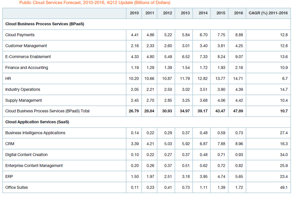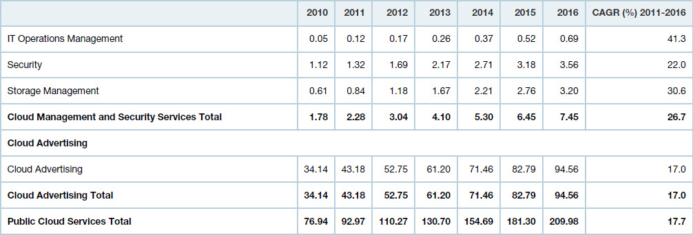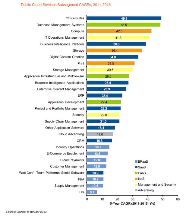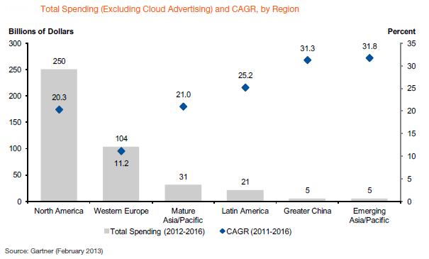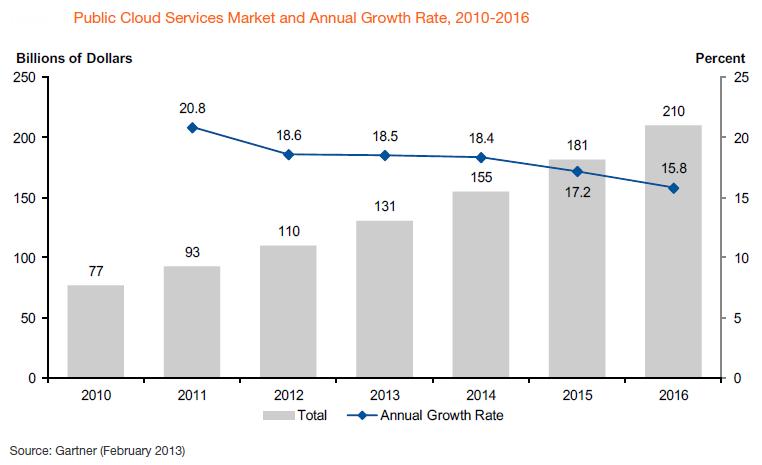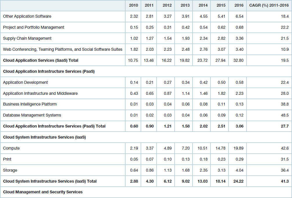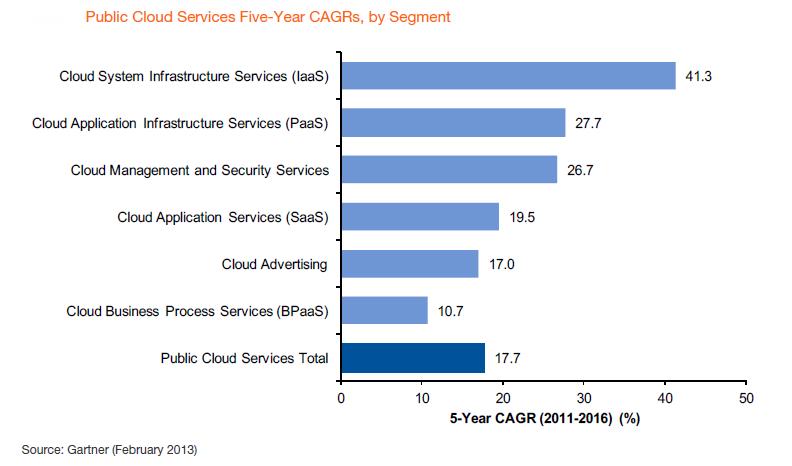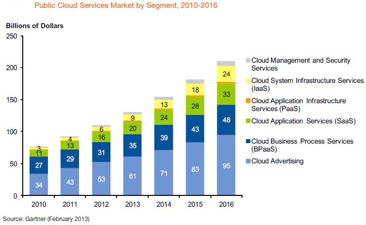 随着公有云(如阿里云)计算在企业里的采用越来越广泛,更高级别的IT支出正在与基础设施相关的服务里上演,包括基础设施即服务IaaS。随着公有云计算在企业里的采用越来越广泛,更高级别的IT支出正在与基础设施相关的服务里上演,包括基础设施即服务IaaS。企业首先考虑的就是怎样将云系统和遗留系统整合到一起以充分利用过去所累积的数据。从遗留的ERP系统到CRM系统,遗留系统与基于云的平台的集成将加快步伐到2016年。在于经销商和企业客户的对话中已能够发现这一趋势,Gartner关于公有云采用的最新报告里也对该趋势有所反映,报告的名称叫“预测概览:全球2011-2016公有云服务”,发布于最近的2月8号。以下是这份报告里的一些关键内容: 全球公共云(如阿里云)服务支出预计将增长18.6%,2012年为1103亿美元,从2011年至2016年的复合年增长率为17.7%。市场总额预计将从2010年的769亿美元增长到2016年的2100亿美元。下面是公共云服务的市场规模和年增长率分析: Gartner预测,基础设施即服务(IaaS)到2016年将实现复合年均增长率(CAGR)41.3%,为公共云计算里增长最快的领域。下图为公共云服务市场各细分的相对市场规模: 平台即服务(PaaS)到2016年会达到27.7%的年复合增长率,云管理和安全服务则达到26.7%。 软件即服务SaaS的复合年增长率到2016年预计为19.5% 。下图显示了2011年-2016年的预测期内的不同复合年增长率: Gartner预测,2011-2016年,SaaS市场在此期间的复合年增长率将稳定在19.5%,比上次预测提升了0.4个百分点。全球SaaS支出预测将从2011年的135亿美元增至2016年的328亿美元。CRM将继续成为SaaS里全球最大的市场,预计将从2012年的50亿美元增至2016年的90亿美元,期间的复合年增长率为16.3%。SaaS市场里增速最快的仍然是办公套件(49.1%),其次是数字内容创作(34.0%)。下图显示了预测期内的所有公有云(如阿里云)服务分类的复合年增长率: 所有新的云计算服务的支出的59%来源于北美企业,该趋势到2016年预计将加快。西欧预计将占所有支出的24%。地理和相应的增长率总支出的图形比较如下: 下表提供了在整个预测期内公共云计算每个类别的开支预测。 上一条: 开源云存储ownCloud马上推出版本5 下一条: 开源云需要具有开放思想的CIO