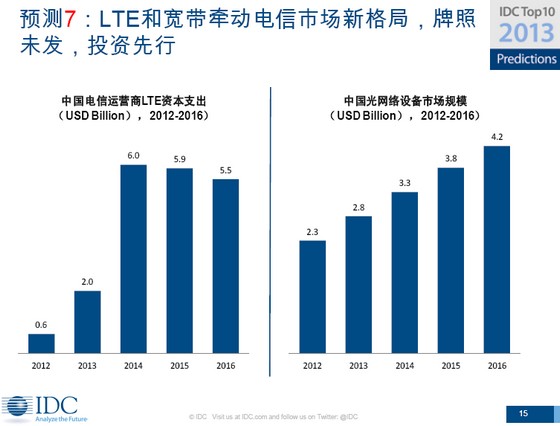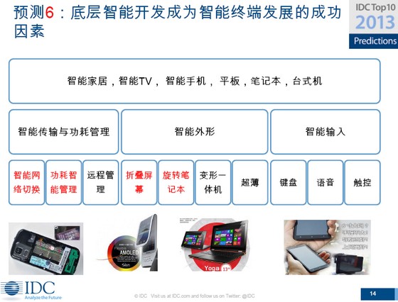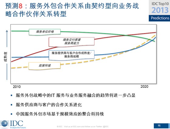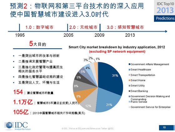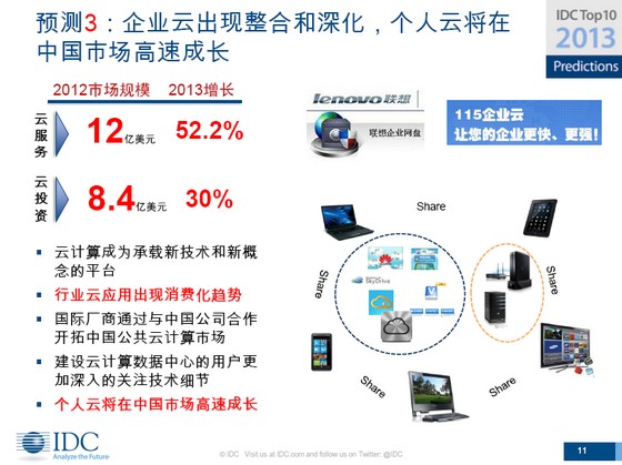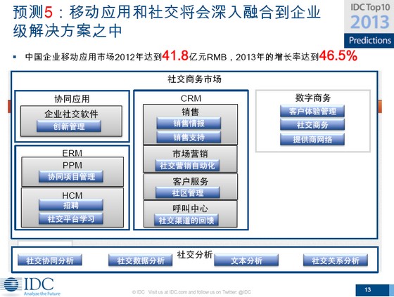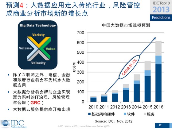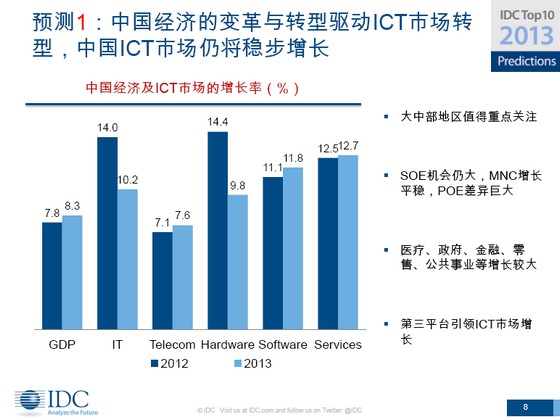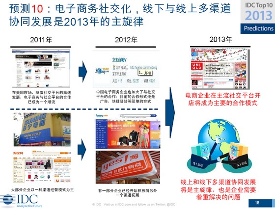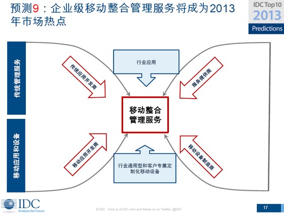 近日,IDC发布2013年ICT(Informationand Communications Technology,信息与通讯技术)产业十大趋势预测。在记者看来,这十大预测的核心可概括为:在看似枯燥的云(如阿里云)计算、大数据、移动化、社交化等概念继续热炒的2013年,谁能够通过亲民、个性化的方式带给用户最棒的体验,谁就能牢牢把握2013年ICT产业的脉搏。 IDC中国助理副总裁武连峰代表IDC发布了这份《2013年IDC中国ICT市场十大预测》报告。 趋势1、中国经济变革与转型驱动ICT市场转型,中国ICT市场仍将稳步增长。 解读:在2013年ICT市场中,硬件产业将呈现下滑趋势,但是软件和服务业发展平稳;包括河南、重庆、河北、西安、江西在内的大中部地区发展值得关注,这些地区在基础设施、人才等方面的发展空间巨大;第三平台(涉及云计算、移动、社交、大数据四个方面)会驱动ICT市场增长,到2013年,第三平台市场份额将占到ICT市场总份额的21.6%。 趋势2、电子商务社交化,线下与线上多渠道协同发展是2013年的主旋律。 解读:2013年社交网站将在微博平台直接开设电子商务商店,这对电子商务解决方案提供商带来较大挑战,怎样把解决方案跟移动、社交、传统电子商务很好结合,线上和线下融合,考验服务商的智慧。 趋势3、物联网和第三平台技术的深入应用使中国智慧城市建设进入3.0时代。 解读:包括物联网、移动、云(如阿里云)计算、大数据在内的诸多应用使城市变得更加智慧、更加感知。截止到目前,已经有150个城市提出智慧城市的规划,政府部门将在未来五年投资1.1万亿用于智慧城市建设。而到2013年,智慧城市建设中与IT相关的产业规模将达到105亿左右。在各地政府公布的智慧城市建设规划中,每100块中大约有30%跟IT相关。 趋势4、服务外包合作关系由契约型向业务战略合作伙伴关系转型。 解读:2013年服务交付价格相对平稳,甚至稳中下降,服务提供商更加成熟,服务能力越来越高。服务外包战略中的IT服务与业务服务融合的趋势将进一步凸显,服务供应商与客户的合作关系进化,中国服务外包市场基于规模效应的整合将持续。 趋势5、大数据应用走入传统行业,风险管控成商业分析市场新的增长点。 解读:在未来五年,大数据市场将增长51.4%,从2011年不到1亿美金增长到2016年超过7亿美金。一说大数据大家首先想到的是数据容量大,有时候这会引起误解,其实大数据离我们很近。 趋势6、底层智能开发成为智能终端发展的成功因素。 解读:智能家居、智能TV、智能手机、平板、笔记本、台式机等设备都可称作智能终端,智能传输与功耗管理、智能外形与智能输入成为智能终端发展的成功因素。2013年一定会出现具有折叠屏幕的手机,另外也会出现更多旋转笔记本、七寸平板、6英寸手机等产品形态。 趋势7、企业云出现整合和深化,个人云将在中国市场高速成长。 解读:2012年,云服务市场规模达到12亿美元,2013年将呈现52.2%的增长;云投资市场规模8.4亿美元,2013年将呈现30%的增长。行业云会出现消费化趋势,不仅支持企业私有云,可能把公有云(如阿里云)引向消费市场。更多外商公有云将落地中国,硬件更多由软件定义,软硬件一体化的产品将占更多份额。个人云将出现两种形式:一方面是企业提供公共云给个人使用,另外是个人在家里搭建私有云环境。 趋势8、LTE和宽带牵动电信市场新格局,牌照未发,投资先行。 解读:LTE和宽带会对视频产业带来极大的促进,视频云的概念将出现并带动产业发展。除中国电信、中国联通之外,中国移动从2009年开始大力投入宽带网络建设,明年会得到固网牌照。投资宽带建设的企业会越来越多。 趋势9、企业级移动整合管理服务将成为2013年市场热点。 解读:传统管理服务提供商与移动应用和设备提供商逐渐向移动整合管理服务靠近。 趋势10、移动应用和社交将会深入融合到企业级解决方案之中。 解读:中国企业移动应用市场2012年达到41.8亿元的规模,2013年的增长率达到46.5%。基于企业移动应用的市场在2013年成长迅速,从移动办公发展到ERP等应用。协同应用、商务分析等应用都将植入移动和社交化的功能。 上一条: 正确的云,过度的炒,泛滥的灾难 下一条: 大型企业还踌躇,中小企业加快以身试水