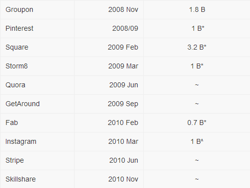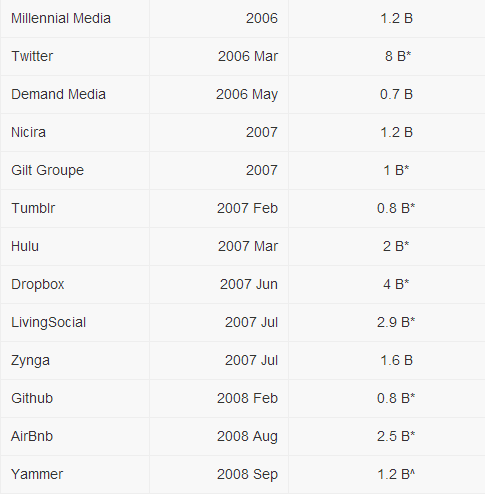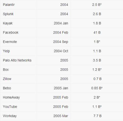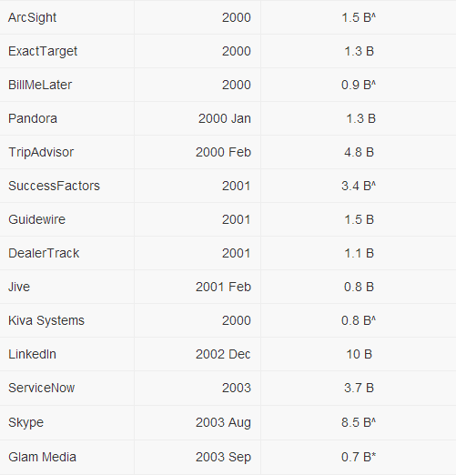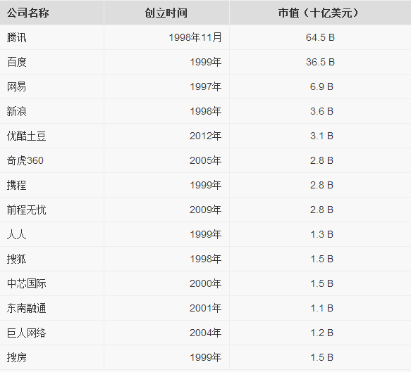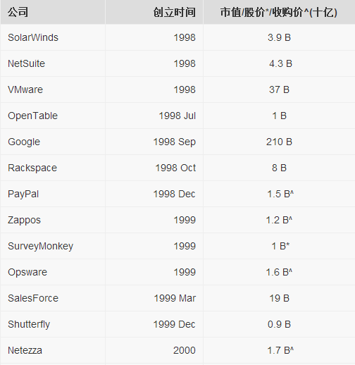 原文作者Min Ming,毕业于斯坦福大学,是人机交互专业的理科硕士,先后在谷歌总部,谷歌中国(北京),微软实习。这篇文章来源于他的博客,以下是文章直译:Ron Conway是硅谷著名天使投资人,是Google最早期的投资者之一,他曾经说过:“每3个月就会有一家上十亿的公司出现,现在,已缩短至两个月了。”我终于得到一个机会来整理这些“10亿美元的”公司,我尽力保证这些公司都是软件技术企业,在此同时,我也引入了一些近10亿市值的公司(含7亿美元以及以上的公司)。 我应该再次强调,这些企业大多数都是美国的软件公司,当然若加上中国的部分企业,这张表会变得更长。每年都会有价值40亿美元的软件公司出现,不过在2000年-2002年是一个“饥荒之年”,当然也是事出有因,在此期间,美国的互联网泡沫破灭,很多互联网企业都受到了影响,这一状况在2013年年底才得到改善(Skype),2004年互联网企业再次进入的发展的黄金时代(Facebook, Palantir, Yelp, Evernote) 留心一下互联网企业的发展,我们会发现,三个月足以打造一个10亿市值的企业。这也意味了,在2011年至2012年之间,还会有8个公司将会成为新的大企业,也许他们现在很年轻,但随着时间的发展,他们会展示自身的价值,我也看好了几个在2009年和2010年之间的初创企业。Google Docs会不断进行更新,同时十分感谢phreeza (HN)。 备注:* 股价是来源于华尔街的最新数据 ^ 收购价是指最后一次收购的价值(就像Skype被收购了数次) 这里也包含了一些初创公司,他们都有很大的机会成为上10亿的企业。当然很难把所有的准确数据都罗列出来,后续还会进行更新。 后记: 我在新浪科技上查找了一些资料,收集了中国互联网企业在美国上市的情况,它们的市值和创立时间如下表: * 备注:数据可能有少许的出入,比如说市值一直在有变化,同时也进行了一些四舍五入的处理,以便与美国的互联网企业做对比。其中腾讯在香港上市,市值是5000.7亿港币,换算的话是645.2亿美元。 对比一下非常明显的看到,中国的互联网企业大都是老牌的“玩家”,虽然优酷土豆今年刚刚建立,但大家都知道他们的背景,绝对不算是“新生力量”,而国外的话,我们会看到很多新背影,比如说Facebook、YouTube、Twitter、Instagram都是在2004年以后才建立的,这点的确值得我们深思。 虽然原文主要是对事实的描述,但我还是欣喜的看到很多公司都涉及云计算产业,Google作为“云计算”的鼻祖,市值已达到2200亿美元,虽然Google不像很多其他的云计算供应商(如阿里云)那样进行铺天盖地的宣传,但没人敢小瞧Google在云计算行业的地位,记得上次Google在公开了数据中心的街景视图时,就引起了很大的轰动,甚至目前在大数据领域混的风生水起的Hadoop也是借鉴了Google的MapReduce分布式处理技术。在云计算领域,我们重点关注的几个公司Facebook、VMware(虚拟化)、Dropbox(云存储)都赫然在列,相信随着云计算的发展,未来他们能走的更远。 上一条: 腾讯公布云计算战略:风暴即将来袭 下一条: 主导未来城市发展:云计算