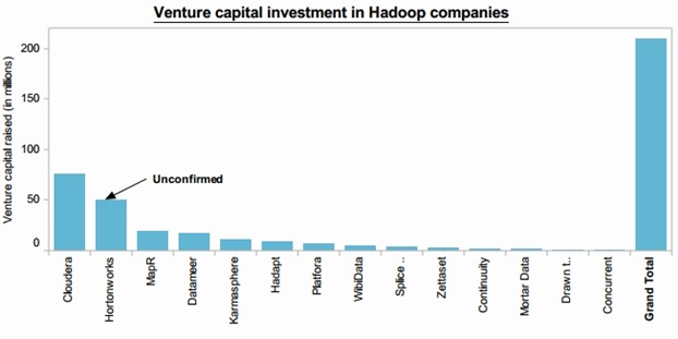 大数据到底是泡沫还是金矿?企业界、媒体乃至公众的广泛关注只是表象,最有说服力的数据来自大数据相关的Hadoop创业公司的估值。Hadoop创业公司大多还未上市,所以关于这个市场的规模和成长性目前尚未有十分准确的数据,但从大数据创投的个案中涉及的资金规模和Hadoop创业公司员工人数,我们依然能够窥斑见豹,对以Hadoop创业公司为代表的大数据创投规模有个大致的了解。 Hadoop创业公司的融资统计 因为大数据核心技术Hadoop属于免费的开源技术,用户无需要付费就可以下载使用,这意味着Hadoop创业公司的盈利模式与Oracle这样的传统数据库巨头大不相同,Hadoop创业公司主要靠提供Hadoop增值产品(软件授权费)和增值服务挣钱。但Hadoop创业公司的成长速度惊人,Cloudera 2009年才成立,而Hortonworks是2011年6月才创立,迄今不到一年半时间。这两家还属于纯大数据厂商(核心业务围绕Hadoop发行版和Hadoop应用展开),那些做Hadoop整合的公司就更是雨后春笋,数不胜数了。GigaOM最近对大数据创业公司的融资情况进行了一次统计,如下图: 从图中可看到,Cloudera、Hortonworks和MapR是目前融资金额最高的“Hadoop三驾马车”,表中所列Hadoop创业公司总体融资规模约2亿美元。 营收和估值快速增长 风险投资蜂拥淘金同时,大数据市场的总体收入规模是怎样的呢?IDC今年五月曾预测Hadoop生态系统的市场规模将从目前的7700万美元,五年内飙升至2016年的8.13亿美元。但IDC的数据遭到业界的质疑,例如没有将亚马逊的弹性MapReduce服务收入(至少每年数百万美元)计算在内。Cloudera首席执行官Mike Olson也认为这个预测有些偏差,甚至没有将Cloudera的收入计算在内。据悉Cloudera目前业务发展良好,今年的营收有望达到1亿美元,甚至更多。而早在2011年,Cloudera的高管就曾透露Cloudera的软件授权销售收入已首次超过服务收入。 而业界也传闻Hortonworks已拒绝了至少一次收购要约,原因很简单,Hortonworks的估值在飞涨中。在最近一轮融资中,Hortonworks的估值已高达2.25亿美元。虽然Hortonworks的第一款产品今年6月才发布,但是让人刮目相看的是,Hortonworks已与微软、Teradata、Rackspace、VMware等大厂商达成合作关系。与Cloudera和Hortonworks并称Hadoop三驾马车的MapR的业绩表现也十分不错,该公司的软件授权收入将随着与亚马逊AWS和谷歌计算引擎(Google Compute Engine)的合作而快速增长,根据该公司市场副总裁Jack Norris透露,MapR有望在2012年第四季度成为软件授权收入最高的Hadoop创业公司。 上一条: 3D可视化技术:大数据的未来?