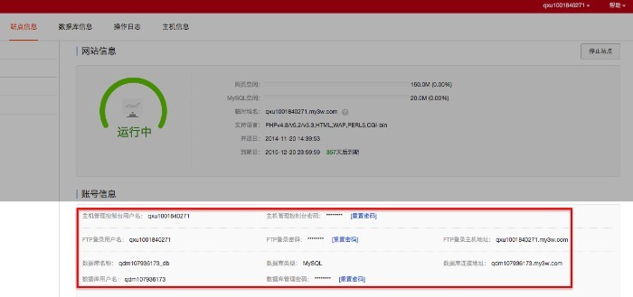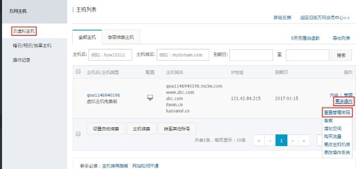 一、首先要确认是否已购买了万网云虚拟服务器,购买成功后就能够登陆阿里云官网http://www.aliyun.com/,再进入管理控制台,点击“云虚拟主机”后选择相应主机的更多操作;购买服务器后第一次查看时,记住要先自行设置管理密码。 二、点击"管理"后,在账号信息中可以查看主机管理控制台用户名和密码,也可点击“重置密码”来修改主机密码