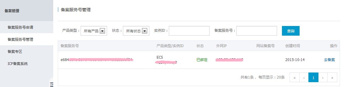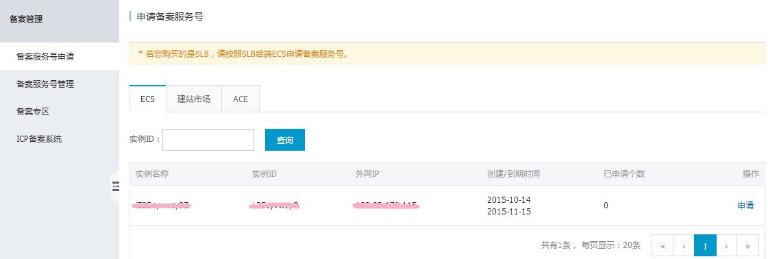 备案服务号介绍: 您在购买阿里云ECS、ACE、SLB、建站市场产品后,通过阿里云进行备案的过程中,需要使用备案服务号来进行产品验证。 如您购买的是万网云虚拟主机,请点击查看具体说明 聚石塔用户申请阿里云备案服务号如何操作,请点击此处了解详情。 怎么备案?请参考备案指导手册 (手册链接):http://help.aliyun.com/guide?helpId=881 温馨提醒: 1. 服务号申请需登录购买服务器的账号中操作; 2. 包年包月且有公网带宽的ECS服务器才能正常申请; 3. 建站市场产品可申请1个备案服务号; 4. 一台ECS可申请5个服务号,协助您提交5次网站备案; 5. ACE需购买时间在6个月以上才能正常申请服务号; 6. 备案成功后已使用的备案服务号即作废,不能再用于其他网站域名的备案,不可重复使用。 具体申请操作步骤参考如下,以ECS服务器申请为例: 1. 购买阿里云ECS服务器后,登录阿里云官网,进入【管理控制台】,点击左侧【备案管理】进入备案服务号管理页面,点击【备案服务号申请】,查到ECS信息,并点击【申请】完成备案服务号申请,进入备案服务号管理页面查看。 2. 【备案服务号管理】查看备案服务号,复制备案服务号,点击【去备案】即可登录ICP备案系统提交备案信息。