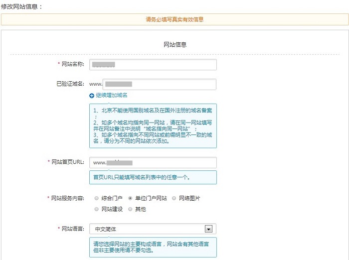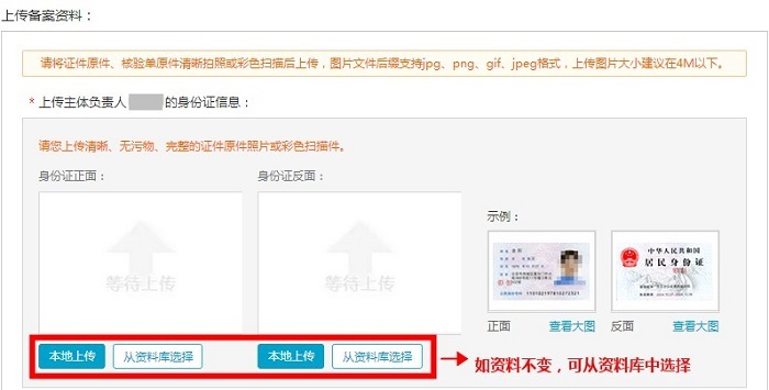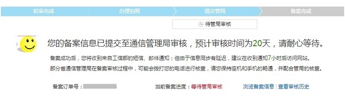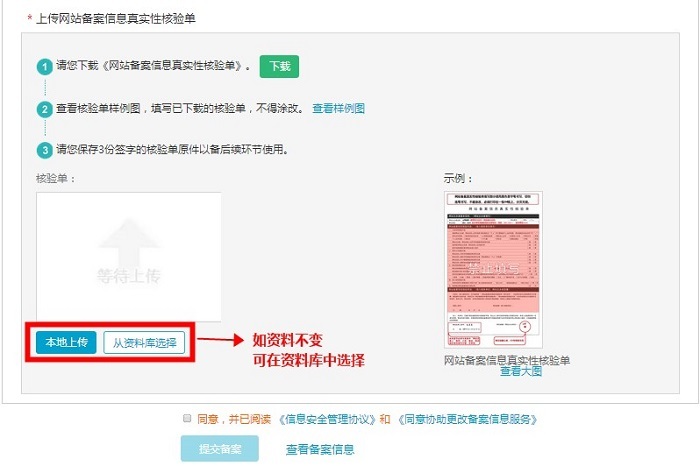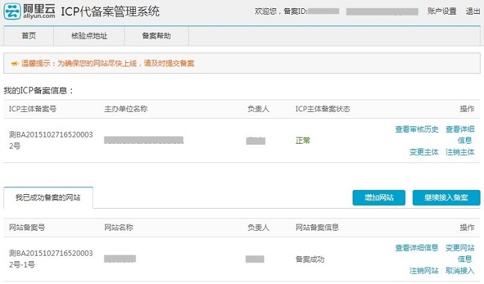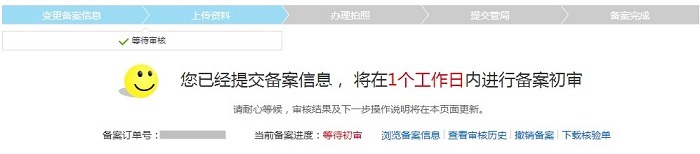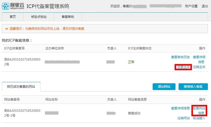 变更备案信息:如果主办者证件和域名已经在阿里云取得了备案号,但是想要修改备案网站信息或者主体信息时,具体步骤流程如下: 1、进入备案系统首页显示已备案成功信息,可选择修改ICP主体信息或者网站信息,直接点击【变更网站信息】或【变更主体】 2、若要修改主体信息,需要重新填写‘主办单位信息’、‘主办单位负责人信息' 3、修改网站信息如下 注意:若想新增加域名,可在“继续添加域名”处填写新域名。 4、上传资料后点击【提交备案】 5.提交备案至初审 6.初审通过后,可进行拍照核验 7.提交照片,等待审核 8. 待提交管局审核 9.等待管局审核 10.备案成功 上一条: 接入备案流程引导图及相关步骤 下一条: 备案前期所需要准备相关资料