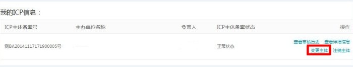 如果您已不再使用填写的主体负责人邮箱,为了能实时查收备案邮件,需要及时变更信息。修改操作如下: 1、登录备案系统aliyun.gein.cn; 2、在首页ICP主体信息后面点击【变更主体】; 3、修改主体邮箱, 确认信息没有问题后点击【保存】; 4、上传资料后点击【提交备案】; 5、提交备案至初审; 6、初审通过后,再进行拍照核验; 7、提交照片,等待审核; 8、待提交管局审核; 9、等待管局审核; 10、备案成功。 上一条: 关于广东省新增接入成功变更备案信息要求 下一条: 备案系统登录账号如何变更及其具体操作流程