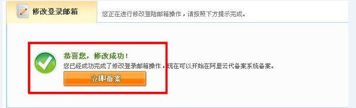 若您登录备案系统的邮箱账号已变更或不再使用,为保证您的备案系统能正常登录,请您及时将登录邮箱账号变更,操作如下: 1、进入备案系统(aliyun.gein.cn); 2、将鼠标滑过右上角的账号信息,点击“账号设置”,选择“修改登录邮箱”; 填写新的登录邮箱信息(新的登陆邮箱未在备案平台注册使用过) 3、修改成功。 上一条: 主体负责人邮箱如何变更及具体流程? 下一条: 如果他人冒领了自己的备案信息怎么办?
