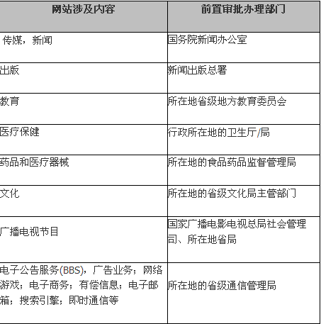 涉及前置审批行业及办理审批部门列表: 涉及内容及审批部门的详细说明: 1、新闻 业务种类:网站登载新闻业务 前置审批定义:主要从事互联网信息服务业务的许可证 审批部门:国务院新闻办公室主管全国的互联网新闻信息服务监督管理工作。省、自治区、直辖市人民政府新闻办公室负责本行政区域内的互联网新闻信息服务监督管理工作。 2、出版 业务种类:网站传播正式出版的图书、期刊内容的网络(含手机网络)及手机游戏、互联网游戏等 前置审批定义:网站涉及有版权内容 审批部门:新闻出版总署 3、教育 业务种类:教育网站和网校等 前置审批定义:申请互联网教育信息服务的许可证 审批部门:所在地省级地方教育委员会 4、医疗保健 审批部门:行政所在地的卫生厅/局 5、药品和医疗器械 业务种类:网站放置药品的说明书、网站卖药等相关信息 审批部门:所在地的食品药品监督管理局 6、文化 业务种类:利用互联网经营娱乐产品,游戏产品运营,网络游戏虚拟货币发行,演出剧,艺术品,动漫产品,从事互联网文化产品的比赛活动、展览等 前置审批定义:网站内容申请文化产业 审批部门:所在地的省级文化局主管部门 7、广播电视节目 前置审批定义:网站内容以视频播放为主 审批部门:国家广播电影电视总局社会管理司、所在地省局。 8、电子公告服务(BBS) 前置审批定义:网站名称以“论坛”命名 审批部门:所在地的省级通信管理局。 温馨提示: 如:未经教育管理部门前置审核同意的,不得以“网校、教育网站”命名;未经新闻管理部门前置审核同意的,不得以“新闻网”命名; 另外:网站名称应与前置审批或专项审批的取得情况对应一致,无新闻、出版、文化、教育、卫生药监、广电等前置审批或专项审批的网站,不得以相关领域关键词命名。 上一条: 如果忘记备案登录账号该怎样操作?