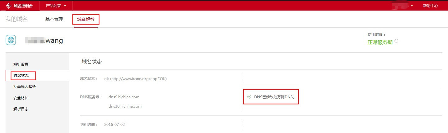 新网互联域名修改DNS有以下几个步骤: 步骤1、登录【会员中心】,登录网址为http://www.dns.com.cn/index.htm; 步骤2、进入【我的域名】; 步骤3、在页面右侧列表找到要修改DNS的域名,点击域名; 步骤4、点击【修改域名DNS】; 步骤5、先将域名服务器选择为【填写具体信息】,然后在输入框中输入DNS,点击【确定】完成修改; 步骤6、设置完成,等待DNS生效,此过程需要48小时; 注意:阿里云解析DNS是自动分配的,不同时间添加的域名所分配的DNS有可能不同。登录阿里云/万网【管理控制台】--【产品与服务】--【云解析】,进入域名解析列表页,添加该域名后,点击该域名方可进入域名控制台。 在【域名控制台】--【域名解析页】--点击【域名状态】,即可查看该域名对应的DNS。 上一条: 全国DNS服务器地址列举 下一条: 如何更新本地DNS? |