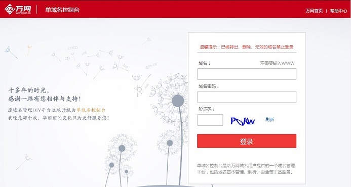 1、单域名控制台是给万网域名用户提供的一个域名管理平台,有域名基本管理、域名解析、域名安全等,服务内容丰富。 2、单域名用户可通过域名密码和域名登录单域名控制台。网站为http://dc.www.net.cn/。 域名密码是用于登录单域名控制平台登录密码,如果您没有万网账号,需要对域名进行管理,您可以联系您的域名代理商(域名代理商查询),让您的代理商为您开启单域名管理平台的域名管理密码。如果您有万网账号,直接登陆万网会员中心,对域名进行管理。 3、单域名控制台功能包含三大类功能:域名基本管理、域名解析、域名安全。其中域名基本管理又包含域名信息修改、域名所有者实名认证、DNS修改/创建、域名证书打印;域名解析包含解析设置、域名状态、解析日志;域名安全包含域名密码修改、域名安全手机管理。 上一条: 域名注册成功后是否能再修改? 下一条: 关于域名管理密码 |