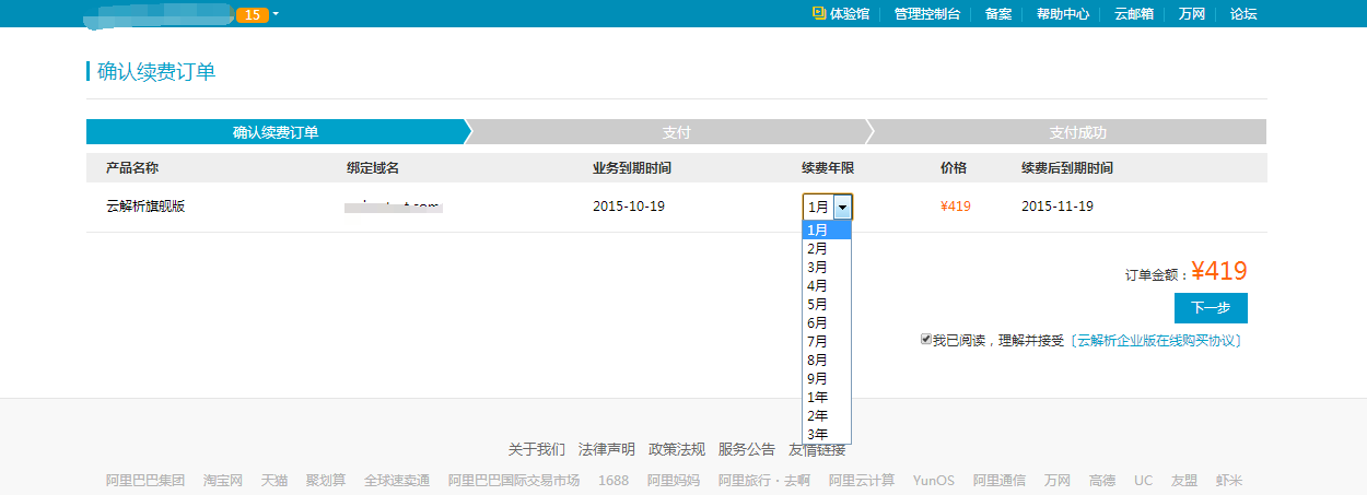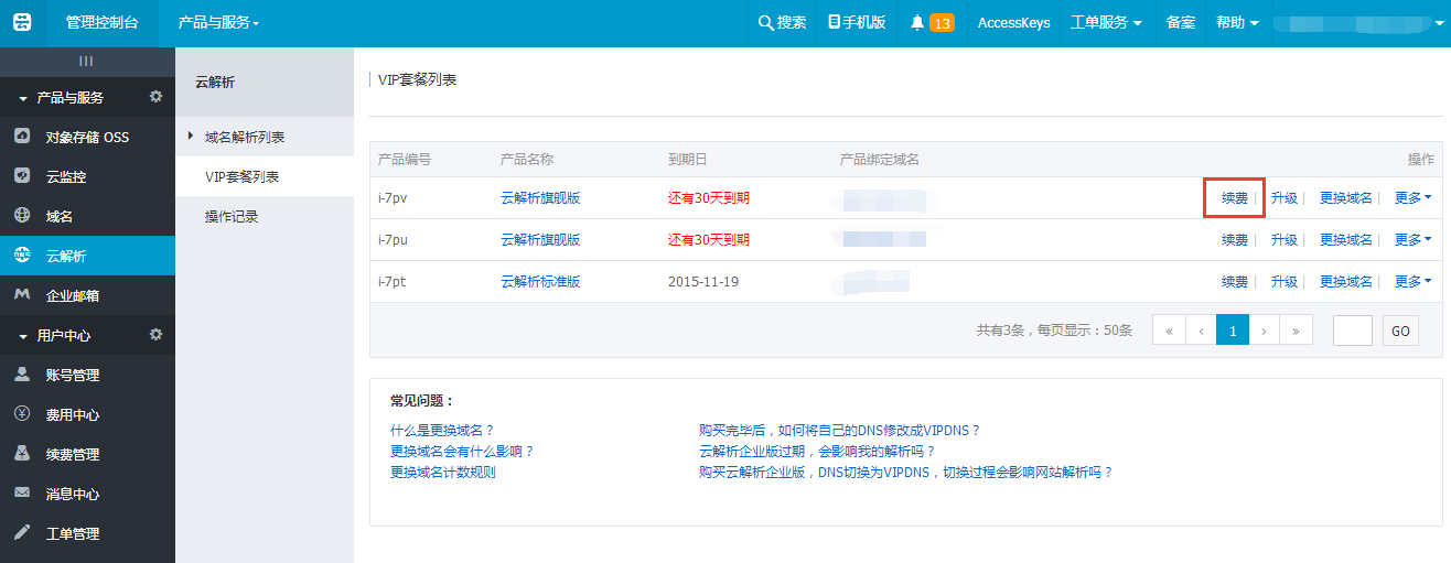 登陆【阿里云账】——选择【管理控制台】——【云解析DNS】——【VIP套餐列表】——选择【续费】——【续费确认】