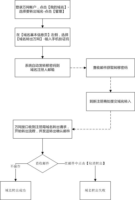 国际域名转出指将在万网申请的国际域名转到万网以外的其他注册商,例如com、net、org、info、biz、me、mobi、asia、name 等国际域名就可转出 首先为了保证您的域名能够顺利转出,请先到万网查询您的域名到期日期是否符合转出条件。 其次,转移过程中需要用您的域名注册人邮箱来接收转移密码。请保证您能正常使用域名注册人邮箱,若信箱为万网的邮箱domainadm@hichina.com,或已经失效,或无法确认管理的邮箱,请去会员区提交国际英文域名信息修改。 具体办理步骤如下: 1)登陆万网会员管理中心——【我的域名】-——选择域名——【管理】; 2)在域名基本信息页左侧,点击【域名转出万网】输入手机验证码,系统会向绑定的手机号码发送验证码,输入验证码进入【下一步】; 3)核对注册人邮箱。系统会将转移密码发送到域名的注册人邮箱;同时给域名管理联系人邮箱发送提醒通知; 4)用户要到新注册商处提交域名转入操作; 5)万网接口收到其他注册商域名转移请求时,会自动发送域名转出确认邮件到域名注册人邮箱,若客户想转出域名,不需要任何操作,域名将会在5天后自动转出。若您想取消转出,按邮件中的提示操作,就可取消域名转出。操作图如下: