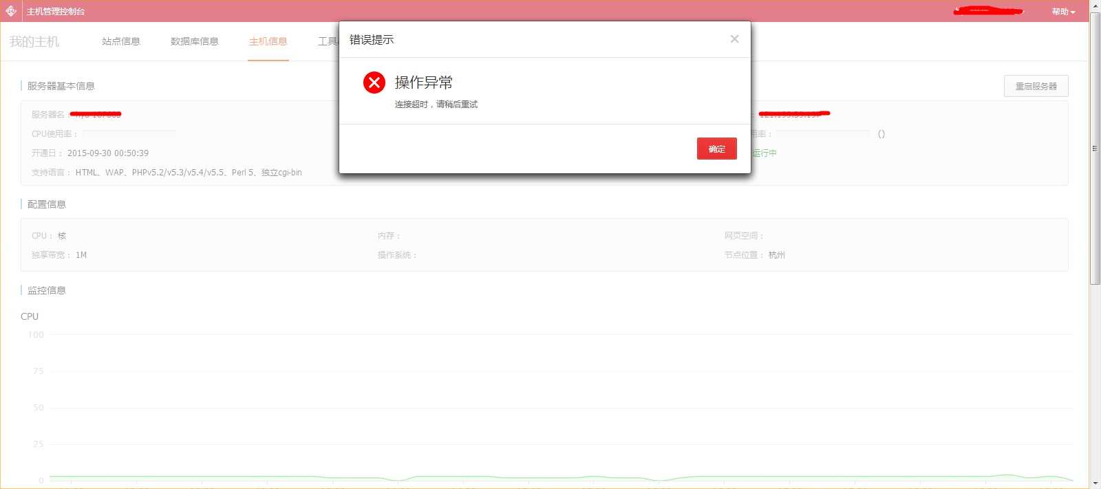 网站无法访问,有一种可能情况是因为程序消耗服务器资源过度导致的,独享版虚拟主机,可以通过主机控制台 cp.hichina.com【主机信息】里面重启服务器。 排查思路: 1、打开cmd,输入ping + 域名 查看网络的通畅性; 2、登陆主机控制台查到主机控制台异常; 3、尝试重启服务器(主机控制台是通过网络获取的主机信息,注意异常时主机控制台相应较慢,请耐心等待)点击【主机信息】-->【重启服务器】; 4、等待重启,查看主机控制台,可以正常显示运行中,不报错时,尝试访问网站。 上一条: 云虚拟主机IO异常的原因分析及解决办法