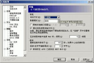 LeapFTP: 在 Options(选项)菜单中选择 Parameters(参数设置),选择其中的(ASCII扩展名),出现列表后,选中其中的“*.PHP”,点击右边的(删除),再点击右边的(确定)即可。如果“*.PHP”项目不存在可直接使用,不需另行设置。 FlashFXP 一、FlashFXP设置二进制:选项/参数设置/传送; 二、FileZilla设置二进制:传输/传输类型/二进制; 三、CuteFTP英文版设置二进制:Tools/Global Options/transfer/General/Transfer/Binary; 四、CuteFTP中文版设置二进制:工具/全局选项/传输/常规/传输方式/二进制。 上一条: 常见第三方开源程序数据库配置文件路径