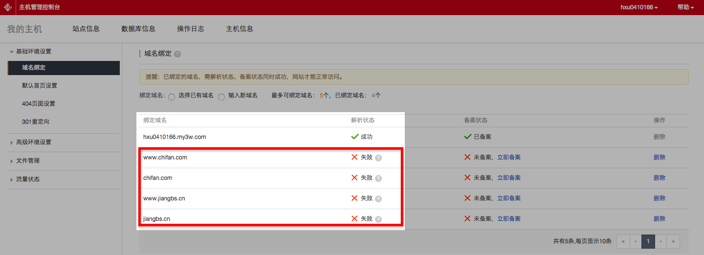 一、主机管理控制台—>基础环境设置—>域名绑定后,域名解析状态显示“×失败”; 二、导致域名解析失败可能原因: 1、域名已解析,但解析的IP地址与主机的IP地址不一致,请指向主机正确IP地址。 2、域名已解析,但因为域名解析需要时间,所以还未生效,生效时间请咨询域名服务商,如果是万网域名,请参考【万网域名解析何时生效】。 3、域名已解析,在本地电脑可以通过域名访问到网站,但在主机管理控制台显示“失败”。因为域名在各地的DNS生效时间不同,所以可能本地DNS已经生效,但在主机管理控制台的服务器使用的DNS上还未生效,请您耐心等待。 4、域名未解析:如果域名刚刚购买,需要在域名管理平台添加A记录,请参考【如何添加解析】。 三、域名解析检查方法: 1、点击开始菜单里—>运行—>cmd.exe ; 2、然后再输入命令:ping一个空格 您的域名,按回车键,可以看到域名解析到的IP地址。 例如: ping chifan.com 域名解析到的IP地址为:173.x.x.x,与主机的IP地址112.x.x.x不同,显示失败; 上一条: FTP客户端软件显示隐藏文件的方法 下一条: 网站开通要素与网站开通的具体步骤