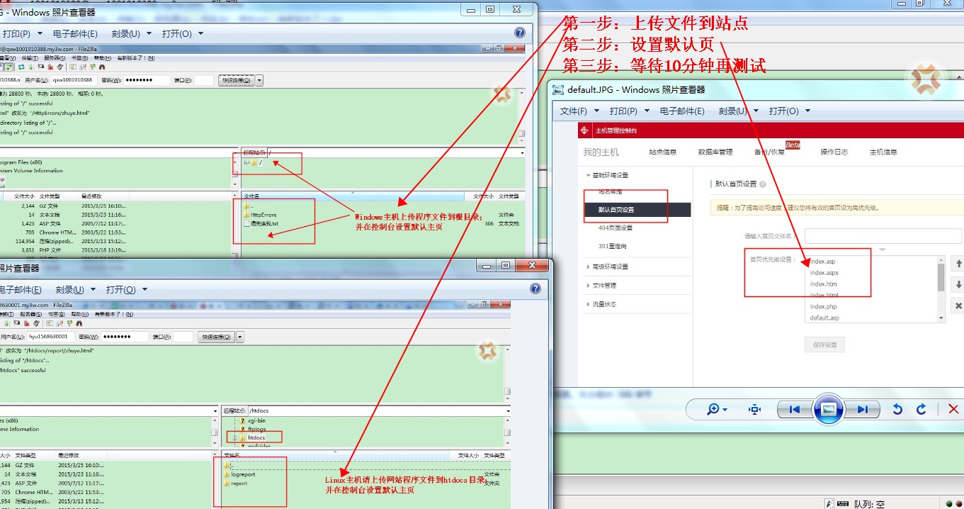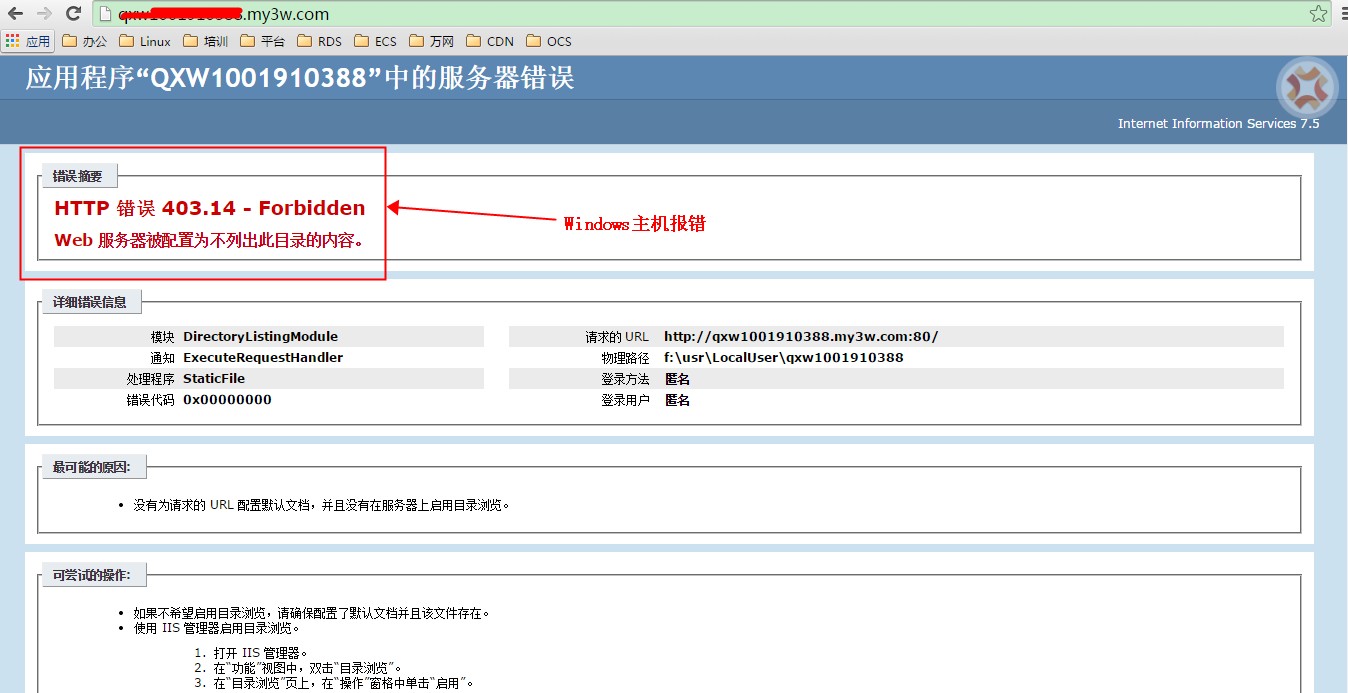 您在使用万网轻云主机或虚拟主机时,访问域名或临时域名时,出现如下错误: 错误原因:这个问题一般是由于网站根目录下没有上传默认的首页文件,主机为了安全考虑,不允许列出文件目录,所以直接访问域名会报403错误。 解决方法: 1. 设置默认首页文件。 2. 访问域名或临时域名。 3. 将网站程序通过FTP上传到主机。Windows主机上传至FTP根目录, Linux主机上传到htdocs目录。 注意事项: 1) 假如您的首页文件放到了upload目录, 那么您需要在域名中指定访问路径: http://qxu1085040960.my3w.com/upload/index.html 这样访问也可以。 2) 假如您的默认首页文件是index.html (默认首页的设置方法在主机CP控制台中,见上图), 那么当您访问域名或临时域名http://qxu1085040960.my3w.com 时,默认访问的是根目录下的index.html文件。 所以如果index.html不在根目录下,就会报403禁止访问的错误。