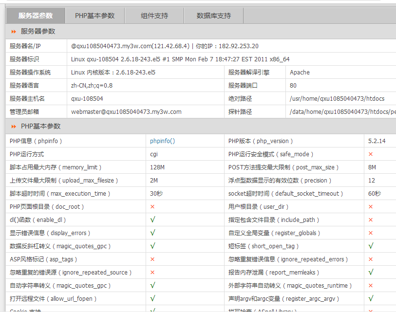 使用虚拟主机或万网轻云服务器查看服务器支持PHP版本或其他配置信息方法如下所示: 1.将 php探针文件,下载到本地电脑上进行解压: 2.通过FTP将pe.php文件上传到服务器(linux上传到htdocs路径下,windows 上传到FTP根路径下) 3.通过临时域名"http://此处替换为主机名.my3w.com/pe.php"方式进行访问,测试效果如图: 上一条: 虚拟主机组件注册后如何使用