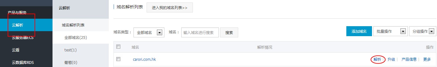 3.看到左面的菜单栏找到【云解析】--【解析】:
