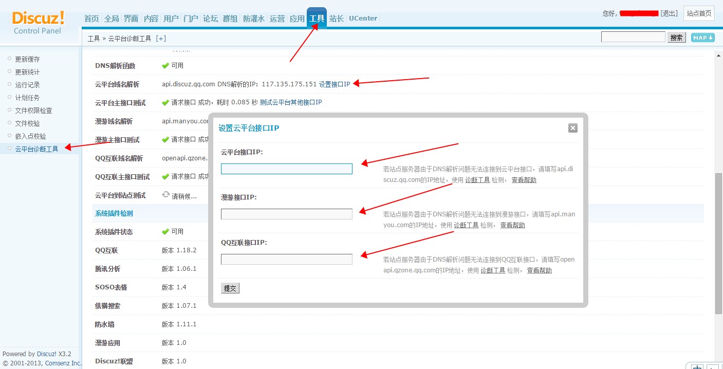 在Discuz站长后台中选择工具—云平台诊断工具—设置借口ip,之后清空其中所有数据,提交后再重新设置登陆。