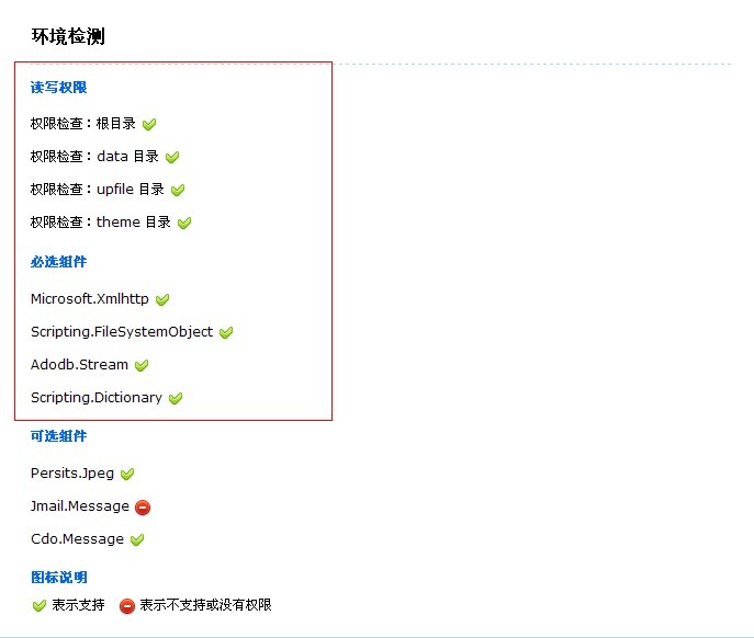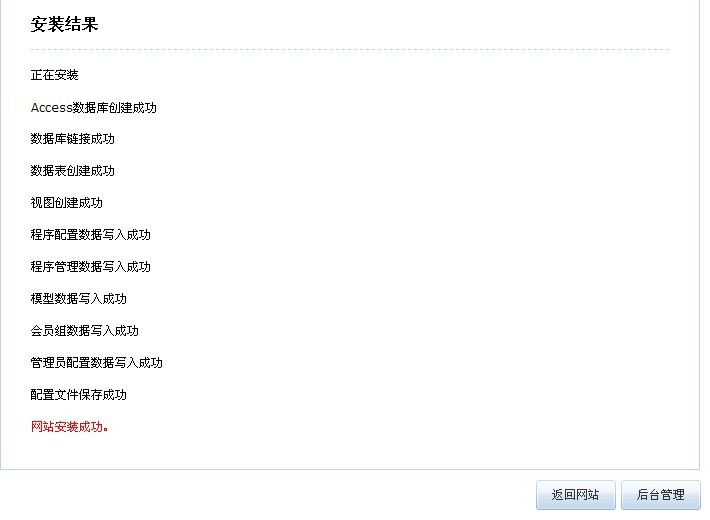1. 将安装程序准备好 从官网上下载然后解压,通过FTP把“上传本目录中文件”里的所有文件上传到阿里云主机的网站根目录下,上传完毕后通过浏览器打开。 2. 安装程序 通过浏览器访问域名,在主域名或临时域名后面加上“install”回车访问。点击【接受协议】按钮,进入下一步安装操作。 3. 安装环境检查 安装程序会进行基本的组件和环境的检查,全部通过就可以进入下一步操作。 4. 安装设置 这里是安装操作的最后一个步骤,首页根据您网站的需要选择数据库,其次填写网站名称和运行模式,最后设置管理员账户和密码,填写好后,点击【下一步】完成安装。 安装好后,效果如下图: 至此网站安装完毕,可以点击【返回网站】浏览网站,也可以点击【后台管理】进行栏目和内容的管理。