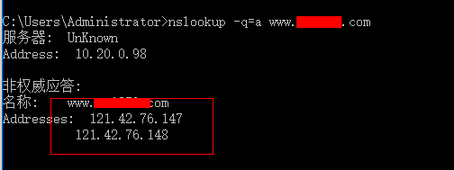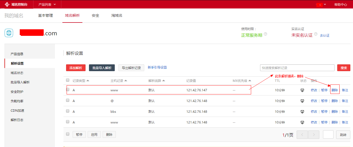 访问域名出现提示如下图所示,但是登录控制面板查看域名解析与绑定正常。如果这个错误并不是一直出现或其他人能够正常访问网站,那么就需检查绑定主机的域名是否做了多条A记录解析。 通常是因为更换操作系统(或主机),却没有删除旧主机解析导致了这个问题,删除多余A记录解析后等待一段时间就行了。 登录主机控制面板查看域名绑定中,已经绑定了自己的域名。还是会偶尔提示错误,如下图所示: 这时需检查自己的域名解析是否解析到了多个IP地址,nslookup -q=a www.abc.com (www.abc.com要改成自己域名)查看自己的解析确实是解析到了两个IP地址了的。 登录域名解析平台删除多余解析就行了。