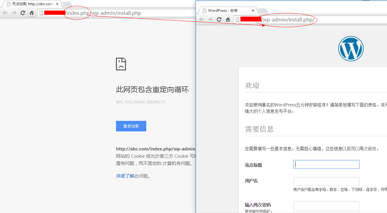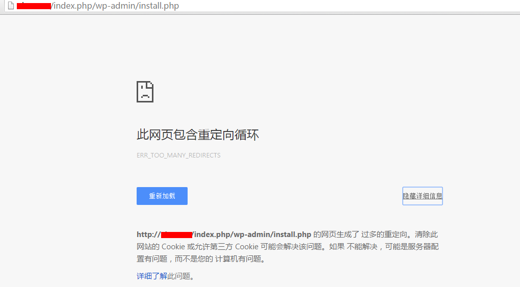 在新安装WordPress时遇安装页面无法打开提示出现循环重定向的问题。Google浏览器的提示如下图所示: