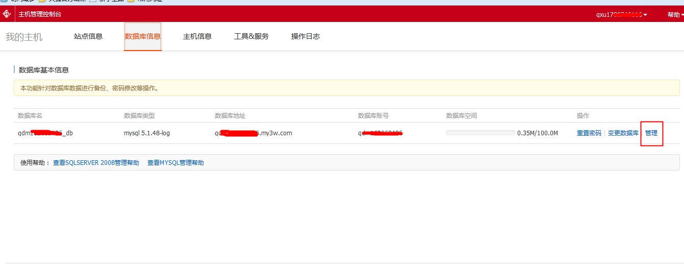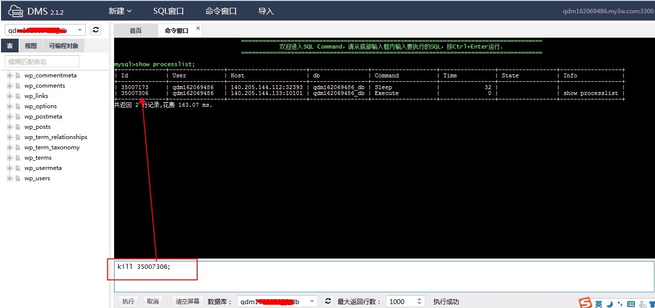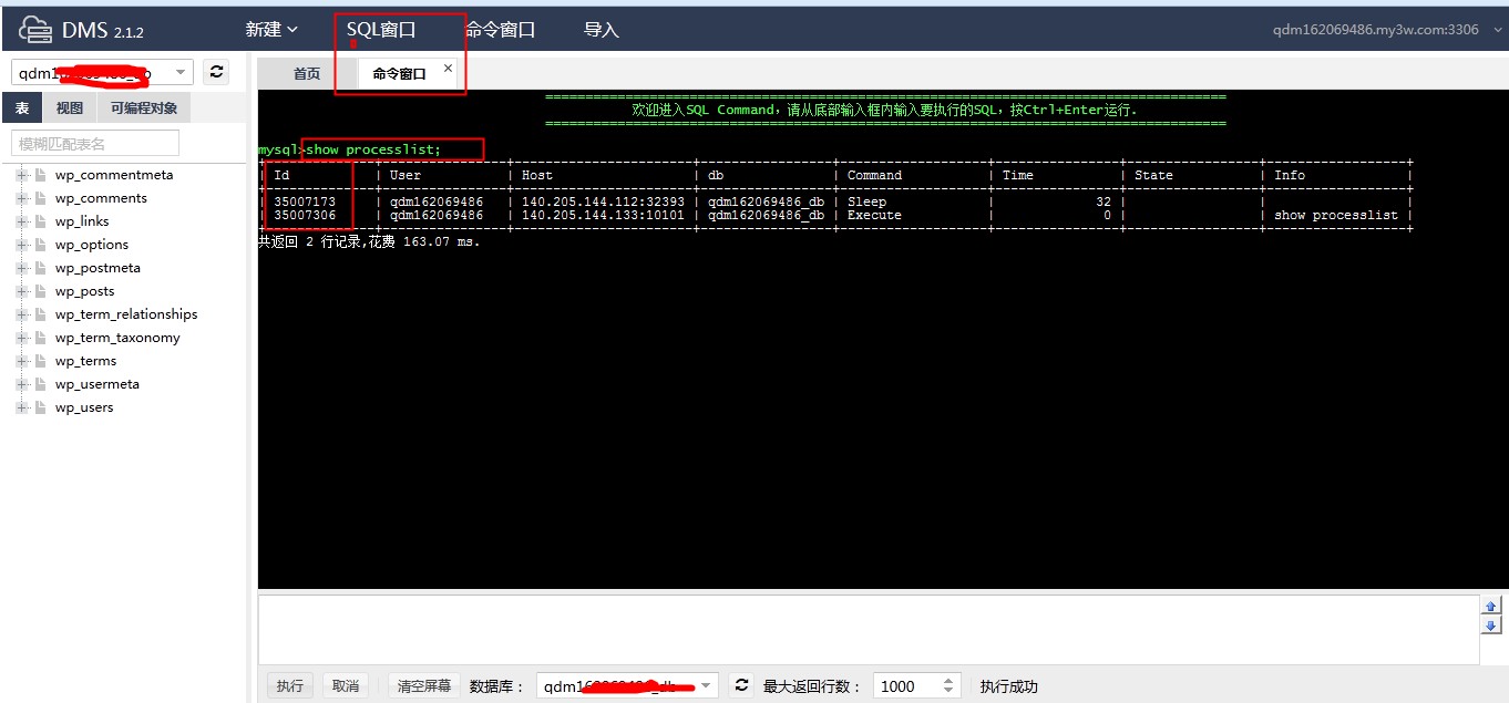 在使用虚拟主机过程中,如果应用程序连接mysql的数量过多,会导致网页程序提示错误如下: Can not connect to MySQL server Error: Too many connections 出现这个问题是因为程序没有及时释放mysql数据库连接,连接数堆积、变满,导致新的连接无法连接到mysql。 可以参考以下解决办法: 1. 登陆DMS控制台; 2. 打开SQL 窗口,输入 show processlist;,点击执行; 3.在上图执行结果中,查看ID列,是当前连接的ID; 4. 输入 kill ID命令结束持续时间很长的连接。 温馨提示: 要从根本上解决问题,需从程序角度排查,检查数据库调用的代码,及时释放数据连接。