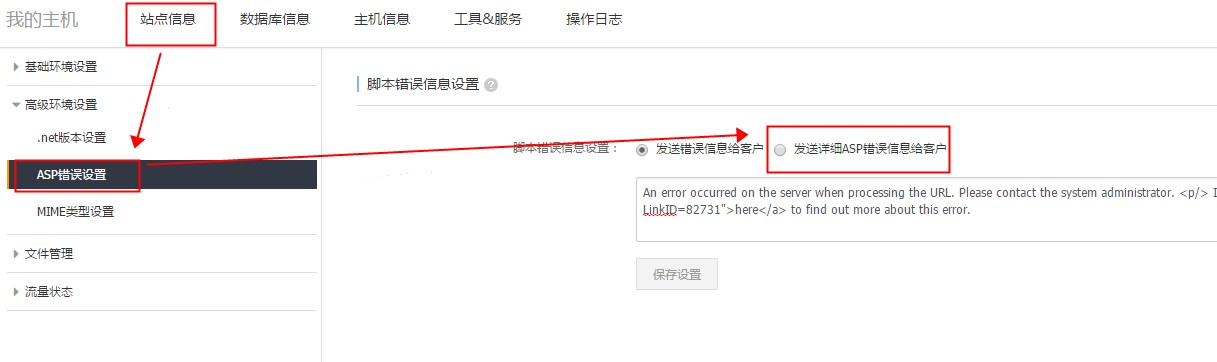 使用云虚拟主机,访问网站报错提示处理url时服务器发生错误,或者 An error occurred on the server when processing the URL ,这个不是真实报错,需要登录主机管理控制台--高级环境设置--ASP错误设置--开启详细的asp错误后,再根据报错作进一步处理。
