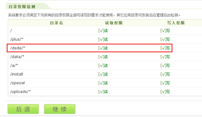 在安装DedeCMS时提示dede目录无读写权限,如下图所示: