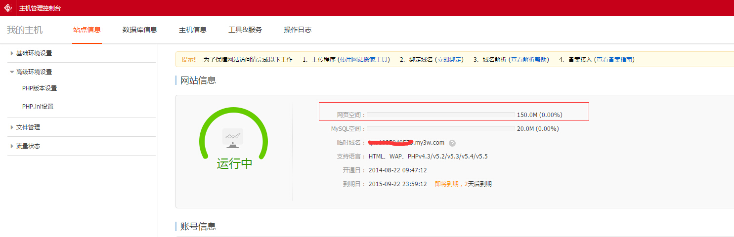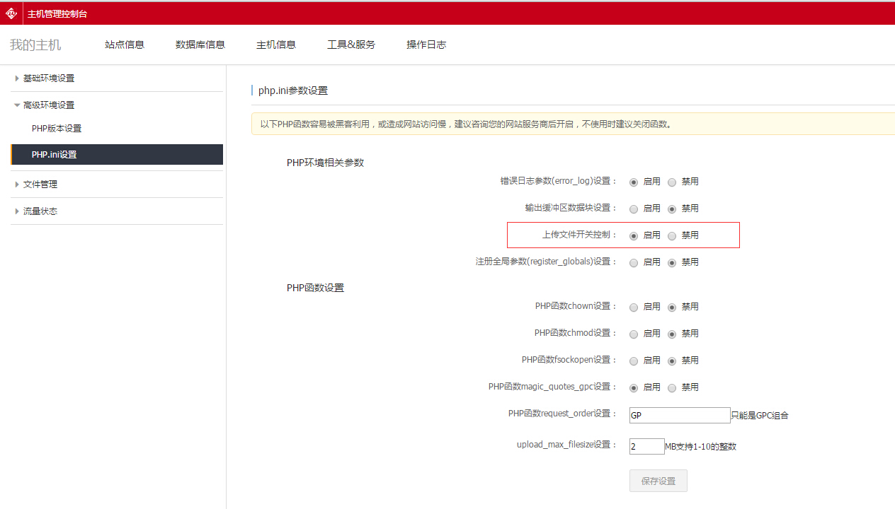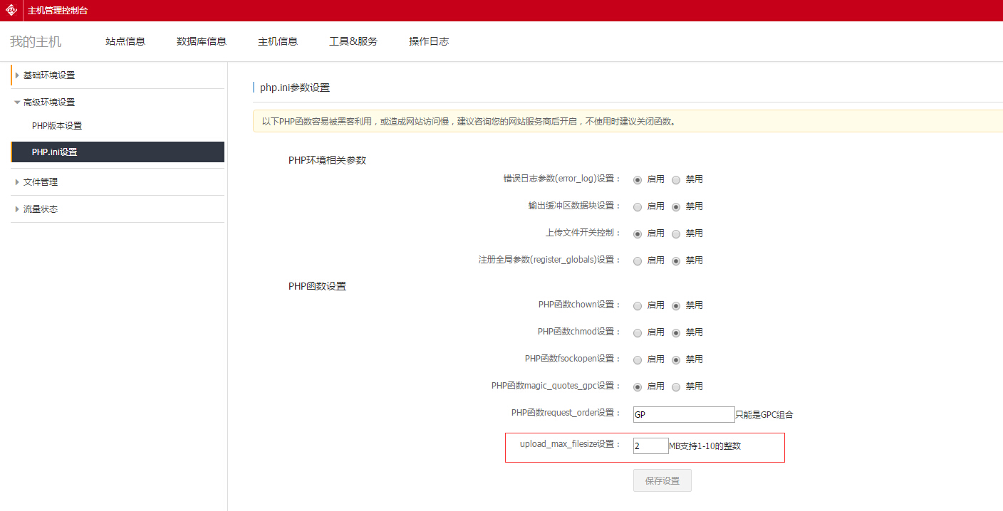 问题场景:Linux系统虚拟主机,通过程序搭建的网站后台上传文件报错且无法上传 解决方法: 1、登陆cp.hichina.com控制面板查看当前空间使用情况,是否是空间使用已满; 2、在控制面板点击左侧高级环境配置--php.ini设置,查看"上传文件开关控制"是否已经启用; 3、同样是在控制面板左侧高级环境配置--php.ini设置宏可以调整upload_max_filesize(即限制上传文件大小)数值大小,支持设置1-10M范围之内,需确认是否超过设置的最大上传文件的大小限制。