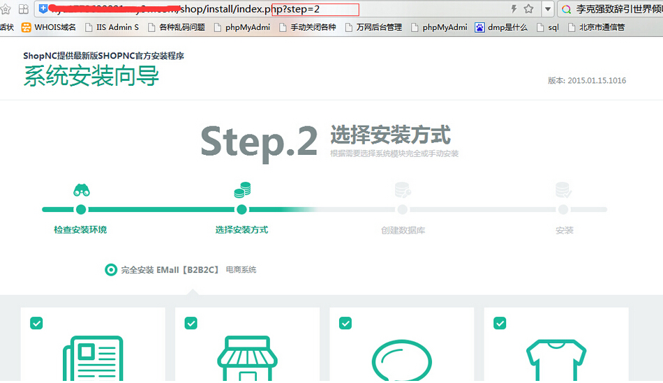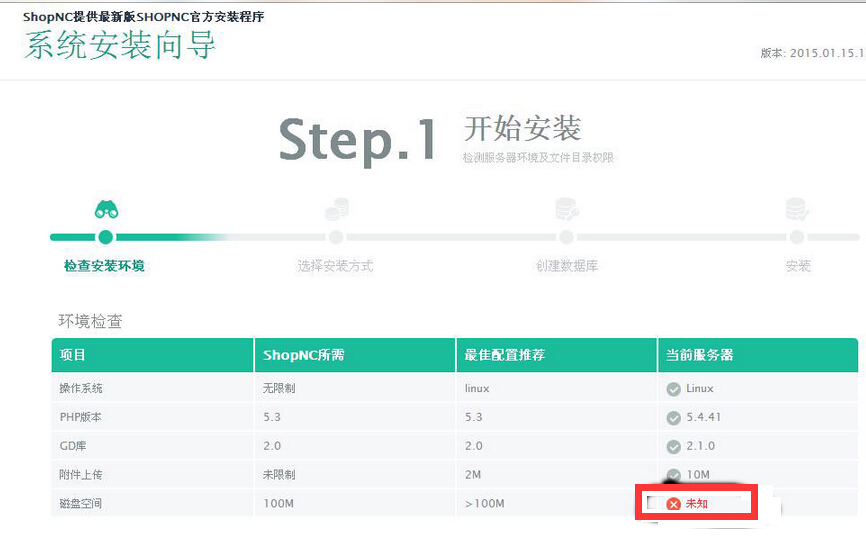 虚拟主机安装第三方应用时提示检测不到磁盘信息 问题描述: 用户在虚拟主机安装第三方应用时有时会安装不成功,提示检测不到磁盘信息。这是因为由于虚拟主机是共享的服务器,而用户的空间信息都是共享同一块磁盘资源。当您在安装第三方应用的时候,是检测不到磁盘信息的。 问题分析: 遇到这种问题是,用户可以在安装页面的url地址上,修改下url地址,跳过此步的安装即可,下面本文以SHOPNC程序为例,为您展示安装的过程时候检测的信息如下: 操作后再在url地址中,将step=后面的信息修改为2,敲回车,这样的话就可以顺利进入第二部,之后继续平常正常安装步骤就可以。如下图所示:
