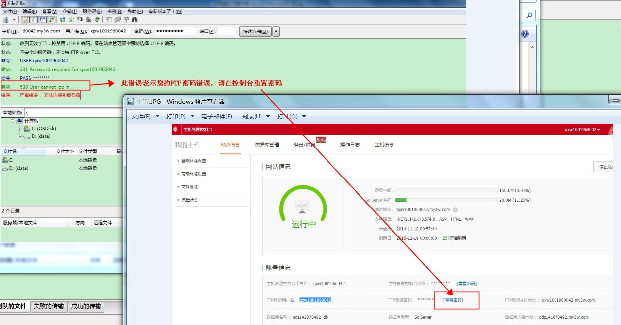 如果您使用的是万网虚拟主机,并且FTP连接不上, 那么您可以通过以下5个方法进行检查: 1. 是否是使用IP地址连接到的FTP? 请不要使用IP地址连接FTP,如果您使用的虚拟主机,由于IP地址共享,很有可能无法连接到FTP,因此我们总是推荐用户使用域名作为FTP连接地址,如图: 2. 连接FTP的客户端不正确。 使用浏览器或Windows 资源管理器很有可能出现无法连接的现象。 我们推荐使用FTP客户端连接,例如CuteFTP或FileZilla等。 FileZilla下载地址:https://www.filezilla.cn/download/client 3. 您连接FTP时的出错信息是什么?请提供截图 如果FTP连接报响应: 530 User cannot log in. 说明您的密码不正确。 请在控制台重置FTP密码。 4. 是否重置密码还是不能登陆FTP? 请提供如下两个命令的运行结果截图: 1) ping “ftp连接地址” 2) tracert “ftp连接地址” 上述两个命令会检查您的网络是否能够正确连接至FTP地址。 5. 您是否能连接其他FTP站点? 如果您经过上述五点检查,仍然不能链接至FTP,请提供如下信息点击【提交工单】反馈您的问题: 上述五点检查结果截图,打包上传至工单; 您的FTP登陆密码,您的公网IP。 您提供的内容越详细,问题解决的时间会越短。 上一条: FTP上传软件常见错误及其相应解答 下一条: 虚拟主机Dede程序安装教程