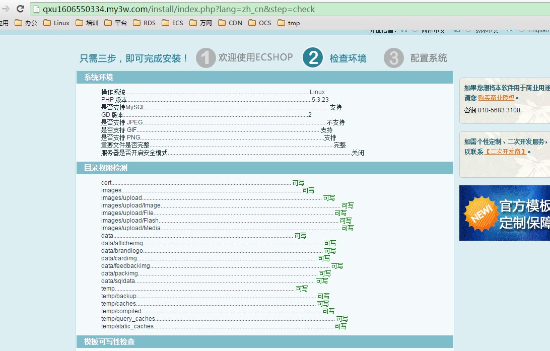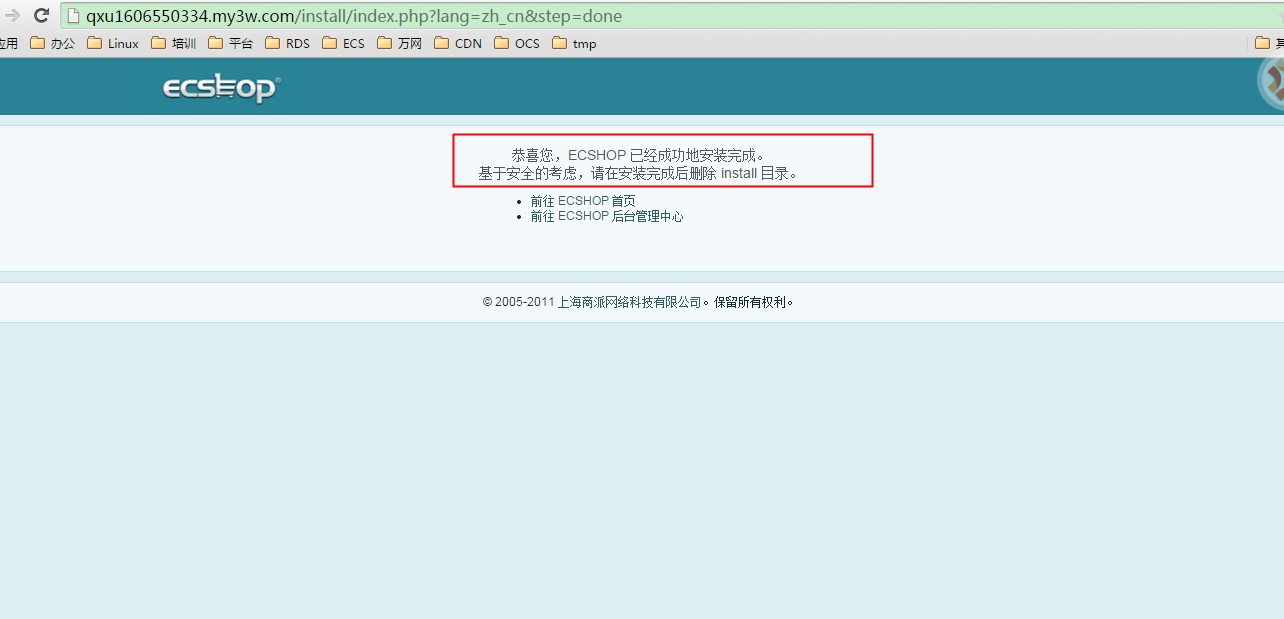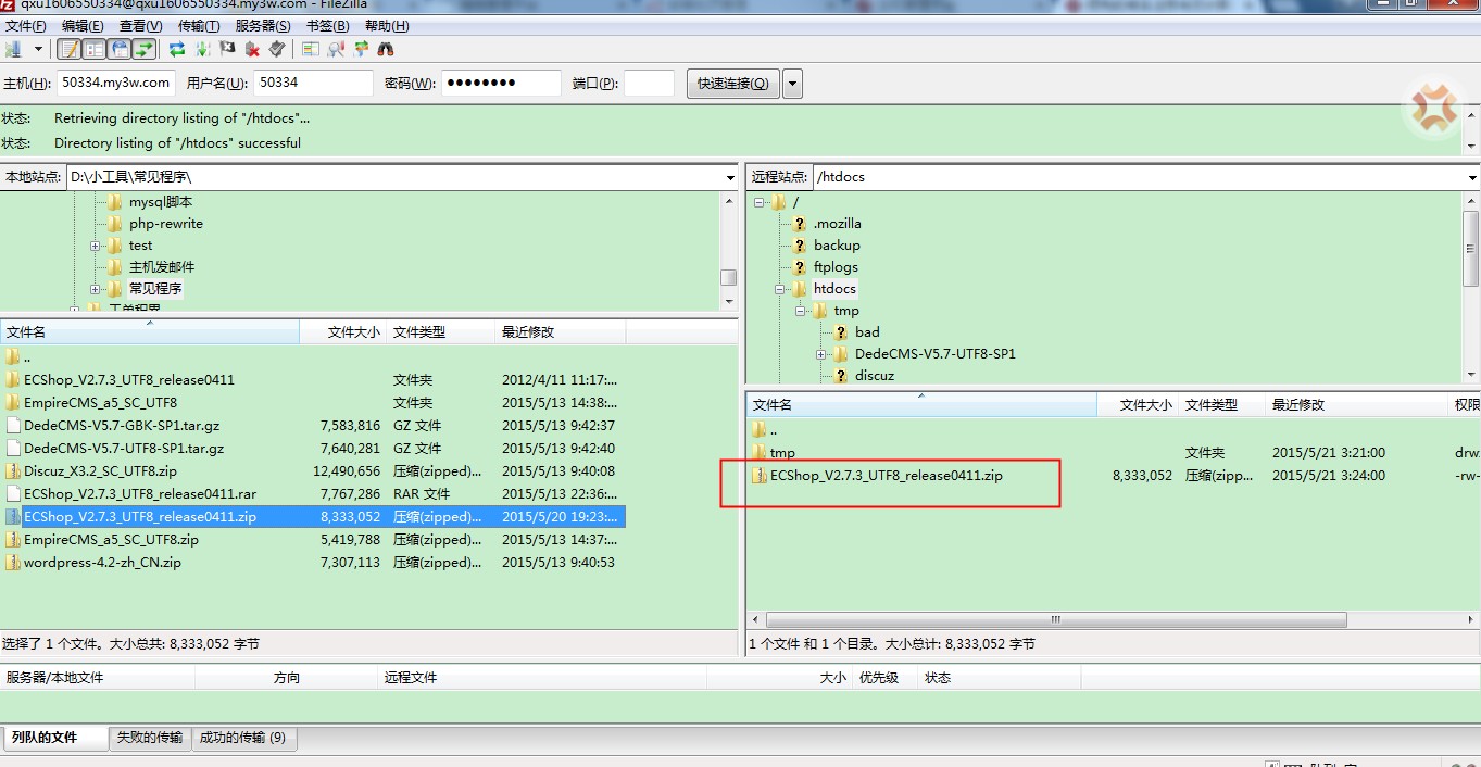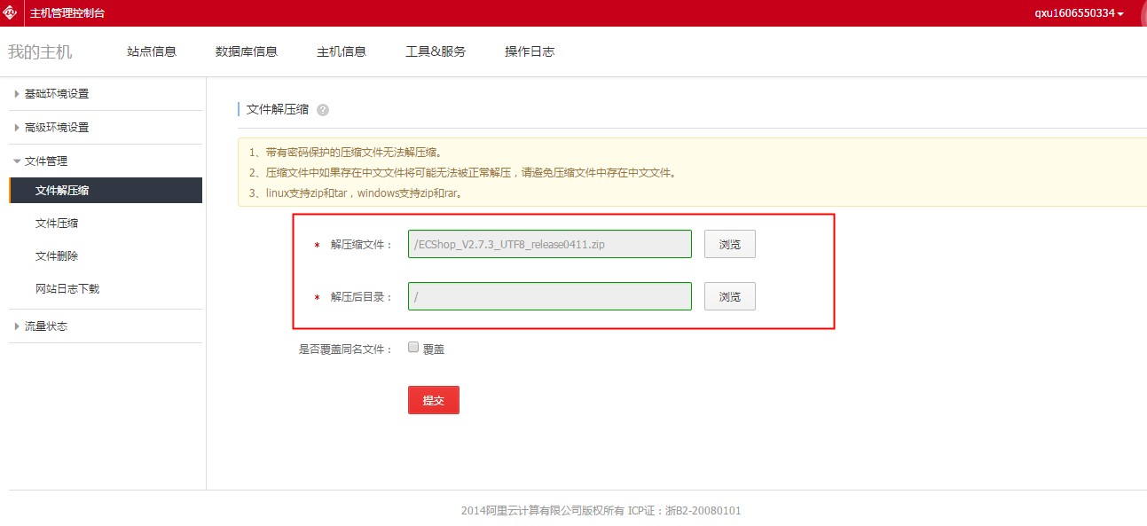 1. 请您自行在网上下载最新版本的ECShop程序。本文以ECShop_V2.7.3_UTF8_release0411.rar为例安装。 温馨提示:如果您使用的是linux系统的主机,ECShop下载的压缩文件是rar格式的,需要先在本地将rar格式的压缩文件转换成zip格式的压缩包。转换方式是将ECShop_V2.7.3_UTF8_release0411.rar解压缩, 然后右键点击解压出来的文件,选择发送到(N) -> 压缩(zipped)文件夹。这样就转成了zip格式的压缩包。 如果不转化,linux系统将无法解压rar格式的文件。 2. 将ECShop程序通过FTP上传到主机上的htdocs目录。 3. 在主机控制台将程序解压到根目录。 4. 将upload目录下的文件全部移动到htdocs目录。本例中的Filezilla客户端直接全选文件,使用鼠标拖动到htdocs目录即可。 5. 确保htdocs目录下有index.php文件。 访问主机临时域名即可开始安装。 6. 请您注意数据库的配置方法。数据库的连接地址并不是localhost,而是主机cp控制台->数据库信息页面中的数据库信息。 7. 如果此处发现数据库无法连接,请确认数据库信息配置正确,请验证一下密码。 8. 之后点击下一步即可完成安装。 至此ECShop程序已经安装成功。 温馨提示:以上帐号和密码信息均为测试信息,非真实用户帐号密码,请您在实际操作过程中使用您服务器和数据库的帐号密码代替即可