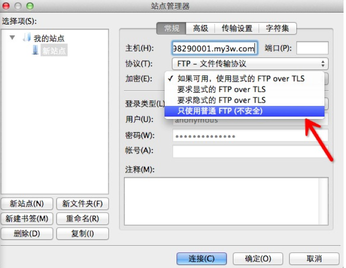 使用FTP客户端连接轻云服务器或虚拟主机的时候,从FTP操作记录中看到客户端在执行AUTH TLS命令后,提示“无法连接到服务器”这个错误信息,具体内容如下图所示: 这是由于目前虚拟主机不支持FTP over TLS的连接方式。FTP over TLS是指客户端显式请求(客户端发送"AUTH TLS"命令)对FTP会话加密。虚拟主机服务器会拒绝请求TLS的连接。 这种错误的解决方案是: 客户可以设置FTP客户端不要求会话加密,即采用普通的FTP会话方式。 以FileZilla软件为例,客户在管理站点的时候,“加密”选择为“只使用普通FTP(不安全)”,如下图所示: 保存站点信息之后,再次连接虚拟主机服务器,测试即可成功。