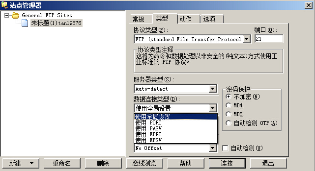 一、FTP连接中的PASV和PORT模式: PASV:也就是Passive的简写,中文就是“被动模式; PORT:其实是Standard模式的另一个名字,又称为Active模式。中文意思是“主动模式。 二、两者之间有什么不同: 1、PASV模式拥有PORT模式的优点及去掉一些PORT的缺点。PASV运行方式就是当服务器接收到PASV命令时,就会自动从端口1024到5000中随机选择,而且还会使用同一个端口来传送数据,不用建立新的连接。 2、PORT这个方式需要在接上TCP 21端口后,服务器通过自己的TCP 20来发出数据。并且需要建立一个新的连接来传送档案。而PORT的命令包含一些客户端没用的资料,所以有了PASV的出现; 三、有的 FTP 服务器是不支持 PASV 模式的,登入時要取消 PASV 模式才行。常用 FTP 下载工具取消PASV 模式的方法如下: 1、FlashGet:点菜单上的“工具”->“选项”->“代理服务器”->“直接连接”->编辑->把“ pasv 模式”前的勾勾去掉,一路确定回来。 2、Cutftp:点菜单上的“文件”->“站点管理”->在“站点管理器”窗口->“新建站点”->填上“域名”->“编辑”->“常规”->把“使用 pasv 模式”前的勾勾去掉: 3、FlashFXP:点菜单上的“站点”->“站点管理器”->站点管理器窗口->“新建站点”->填上“域名”->“选项”->把“使用被动模式”前的勾勾去掉->“应用” 即可。 4、NetAnts:点菜单上的"选项"->"参数设置"->"代理"->“直接连接”->编辑->把“ pasv 模式”前的勾勾去掉,一路确定回来。 5、FileZilla:点菜单上的“站点”->“站点管理器”->站点管理器窗口->“传输设置”->“传输模式”->选择“主动”或“默认”即可: