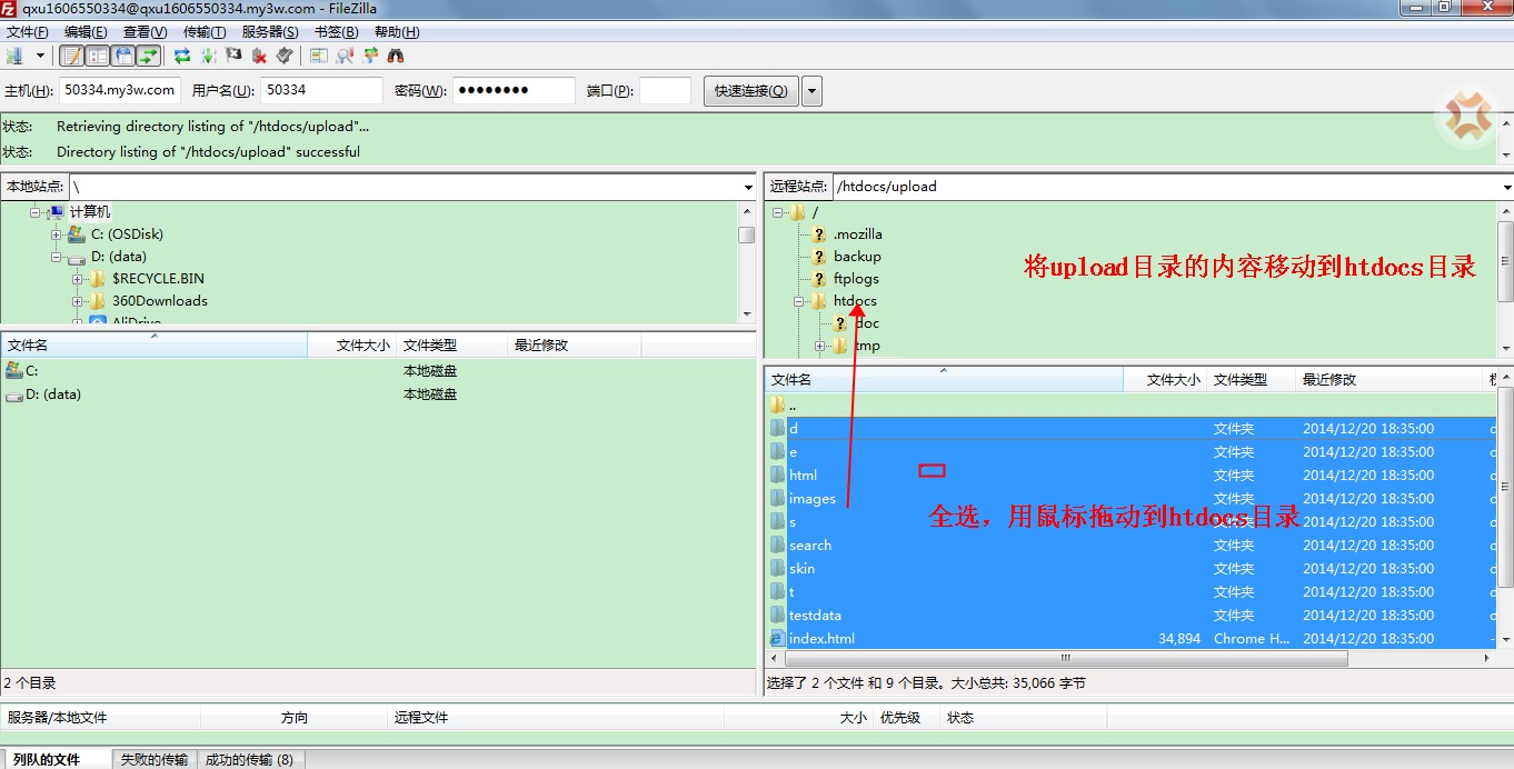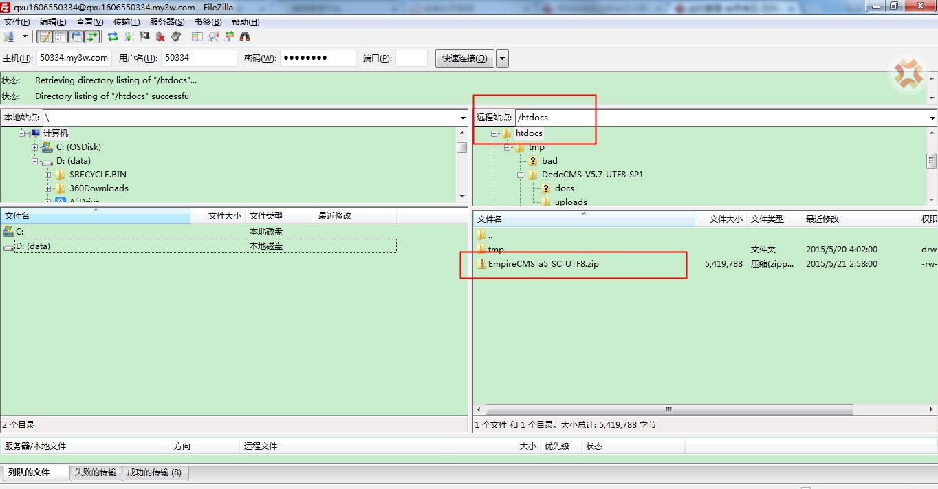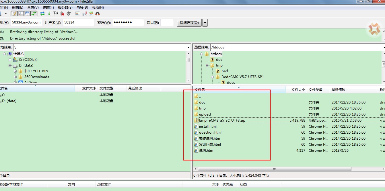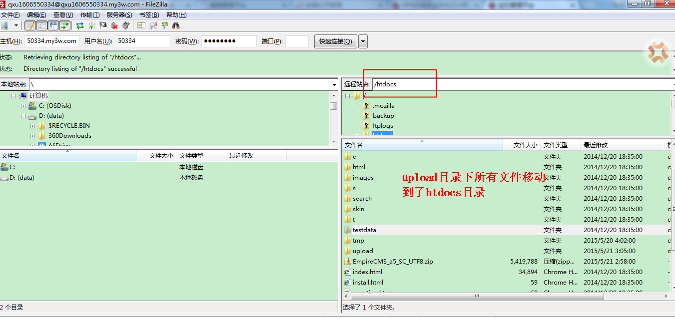 1. 请在网上下载最新版本的EmpireCMS程序。本文以EmpireCMS_a5_SC_UTF8.zip为例安装 2. 将EmpireCMS程序通过FTP上传到主机上的htdocs目录。 3. 在主机控制台将程序解压到根目录。 4. 将upload目录下的所有文件全部移动到htdocs目录。本例中的Filezilla客户端直接全选文件,使用鼠标拖动到htdocs目录即可。 5. 确认htdocs目录下有index.php文件。 访问主机临时域名即可开始安装 6. 请注意数据库的配置方法。数据库的连接地址不是localhost,而是主机cp控制台->数据库信息页面中的数据库信息。 7. 如果此处发现数据库无法连接,请确保数据库信息配置正确,请验证一下密码 8. 之后点击下一步即可完成安装 至此EmpireCMS程序已经安装成功。 温馨提示:以上帐号和密码信息均为测试信息,非真实用户帐号密码,请您在实际操作过程中使用您服务器和数据库的帐号密码代替即可