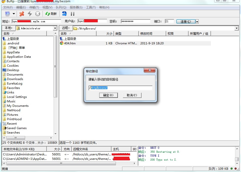 以8uftp为例,可按以下步骤操作: 1. 登录ftp后选中要移动的文件(例如移动httperrors下的404.htm到上级目录)。 [图1] 2. 将/httperror修改为目标目录 以FileZilla为例: 1. 将old.rar移动到HttpErrors文件夹 [图4] 2. 将old.rar移动到上级目录,拖动old.rar文件到文件夹。 上一条: Window系统上传文件到Linux系统不能使用DOS格式 下一条: 怎样在浏览器中进行FTP访问?