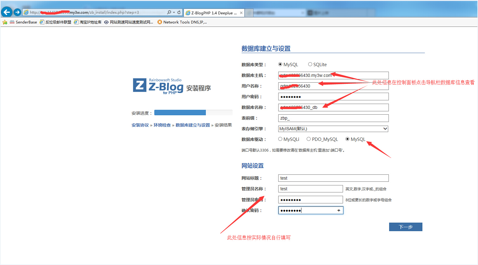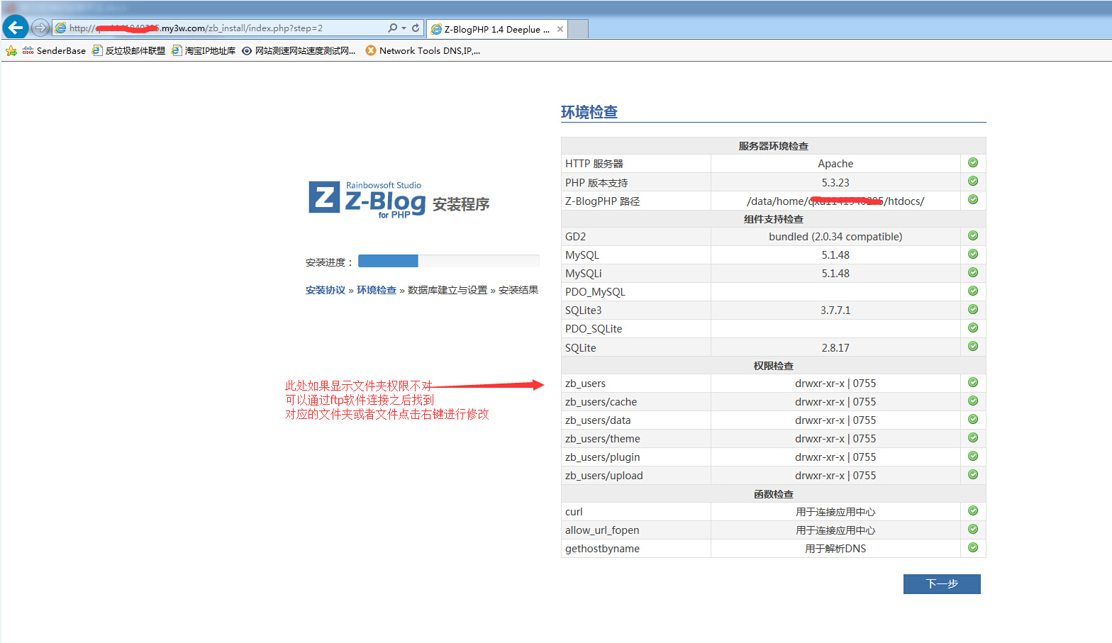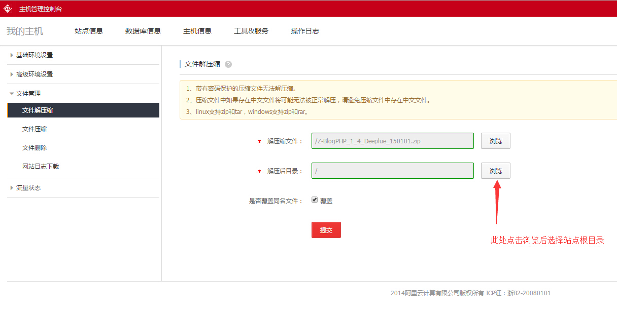 关于虚拟主机安装ZBLOG程序的参考方法介绍 Linux系统虚机主机用户安装ZBLOG程序参考方法如下所述: 第一步:首先,下载网站源码,将压缩包上传至ftp连接之后看到的htdocs文件夹,如下图所示: 第二步:上传之成功后请登陆虚拟主机控制面板cp.hichina.com,点击左侧网站文件管理-文件解压缩将压缩包解压至站点根目录,如下图所示: 第三步:解压成功之后会看到程序文件是放在Release目录下,这时需要将这个目录下的文件全部移动到/htdocs文件夹下,如下图所示: 第四步:访问临时域名qxu159*****.my3w.com进行安装,同时建议先登陆cp.hichina.com控制面板,点击左侧高级环境配置—php.ini设置开启fsockopen函数,如下图所示: 第五步:配置数据库,数据库信息可以在cp.hichina.com控制面板点击导航栏数据库信息查看到,请注意数据库主机不是localhost,如下图所示: 当出现下图时,就代表安装成功。 温馨提醒:使用过程中如果您修改了数据库密码,请将/htdocs/zb_users里记录的数据库密码进行同步,数据库配置文件如下图所示: 如问题还未解决,请联系售后技术支持 上一条: MSSQL数据库测试连接的快捷方法介绍 下一条: 在制作完网站后怎样上传网站程序