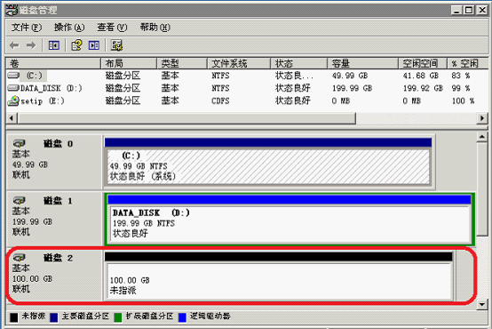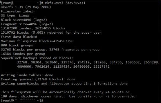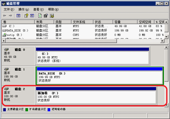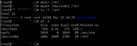 一、 Windows服务器 前提:用管理员身份登录 挂载磁盘步骤: 1、 打开磁盘管理器 在“开始菜单->运行”中输入diskmgmt.msc 打开磁盘管理界面 可以看到有一块没有设置盘符的新磁盘(磁盘2) 2、创建新的磁盘分区,在磁盘2的图示上点击“右键”->“新建磁盘分区” 打开“新建磁盘分区向导” 一路下一步,在这个界面中,确保选中红线标注的这两项,选中后继续点“下一步”,开始磁盘分区和格式化操作。 3、 确认成功 格式化完毕后,看到“磁盘2”上已经分配了盘符(新加卷 (F:)),就说名已经成功了,此磁盘已经可以正常使用。 二、 Linux(Aliyun Linux 64位) 服务器 前提:使用root身份登录 挂载磁盘步骤: 1、 查看磁盘列表 命令:fdisk –l 在下面的截图中,我们能看到一块数据盘:/dev/xvdb1 系统已经自动给/dev/xvdb1划分了分区 2、 格式化/dev/xvdc1分区 命令:mkfs.ext3 /dev/xvdb1 3、 挂载/dev/xvdc1分区到/data1目录下 命令:mkdir /mnt mount /dev/xvdb1 /mnt ls -l /mnt df -h 4、 如果要让这个挂载持久,需要再修改一下/etc/fstab 命令:echo "/dev/xvdb1 /mnt ext3 defaults 1 2" >> /etc/fstab