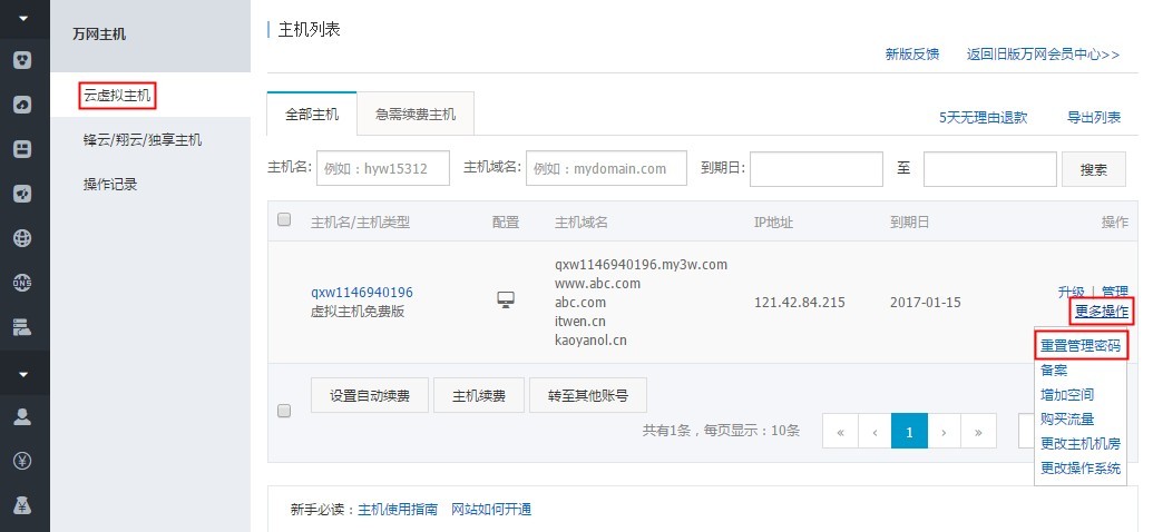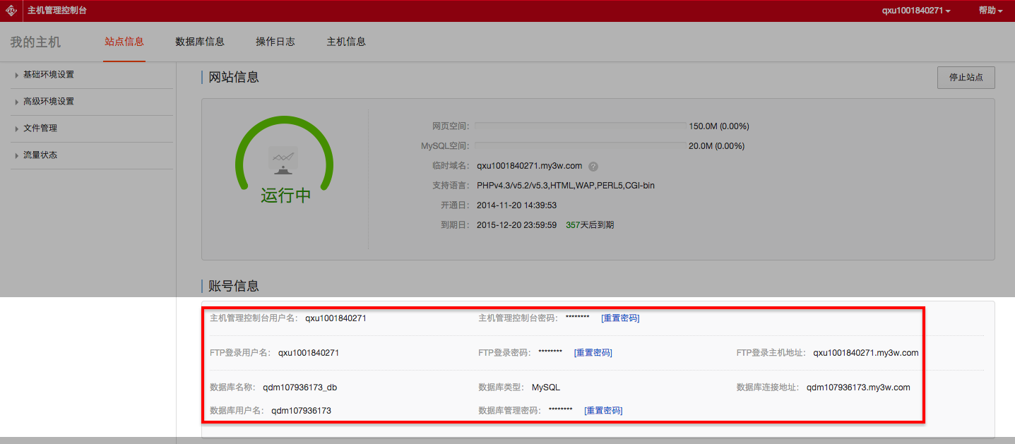 一、登录阿里云官网http://www.aliyun.com/,进入管理控制台,点击“云虚拟主机”后选择相应主机的更多操作,点击“重置管理密码”即可修改;主机名即主机管理控制台的登录名,主机管理密码不同于FTP密码。 二、进入"主机管理控制台"后,在站点信息中查看主机管理控制台的登录名,如忘记密码,在此可以重置FTP登陆、主机管理控制台及数据库管理密码;修改主机密码请参看如何修改主机密码。 三、如需修改数据库密码、FTP密码,可以通过对主机业务进行“管理”,免登至"主机管理控制台"进行修改。 如您的问题还未得到解决,请联系售后技术支持。 上一条: 怎样获取主机的信息? 下一条: 云虚拟主机新手使用指南