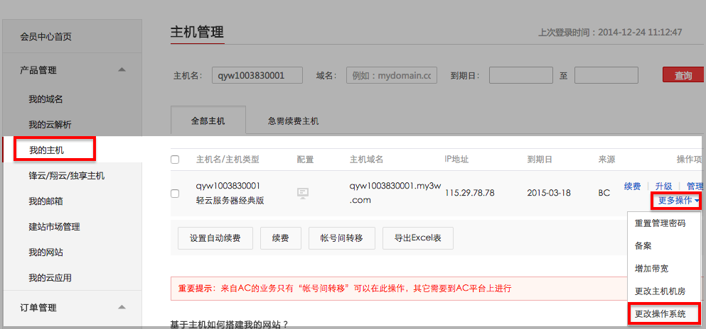 轻云服务器更换操作系统流程 第一步:首先,登录官网www.net.cn,会员登录,选择点击“我的主机”后选择相应主机的更多操作,再点击“更改操作系统”。如下图所示: 第二步:点击更改主机操作系统按钮,进入更换页面后,选择新操作系统,并点击”下一步”,如下图所示: 温馨提醒:轻云经济型版只有Linux系统,不支持更换操作系统功能; 第三步:确认没有错误后后点击“提交”后会有提示注意事项,如确定要更换系统,请再次点击“确定”后就将更换操作系统,主机的信息将改为新主机。如下图所示: 附:注意事项: (1)、更换操作系统,这项服务为免费的服务,每天(0:00~24:00)仅能操作一次,请谨慎操作。 (2)、如果更改成功后,您的备案信息需要一小时左右的系统同步时间才能进行管理,但不会影响备案状态和域名绑定状态。 (3)、原主机数据只会保留7天,过期将被彻底删除,不能恢复,请及时备份网站和数据库的数据。 (4)、更换操作系统后您的主机IP和数据库IP都会发生变化,请更改数据库连接串,并上传网站数据到新主机,网站调试完成后请及时更改域名解析。 温馨提示: 香港机房的轻云服务器目前暂时不支持更换操作系统,如果购买错误请退款后重新购买。 如问题还未解决,请联系售后技术支持。